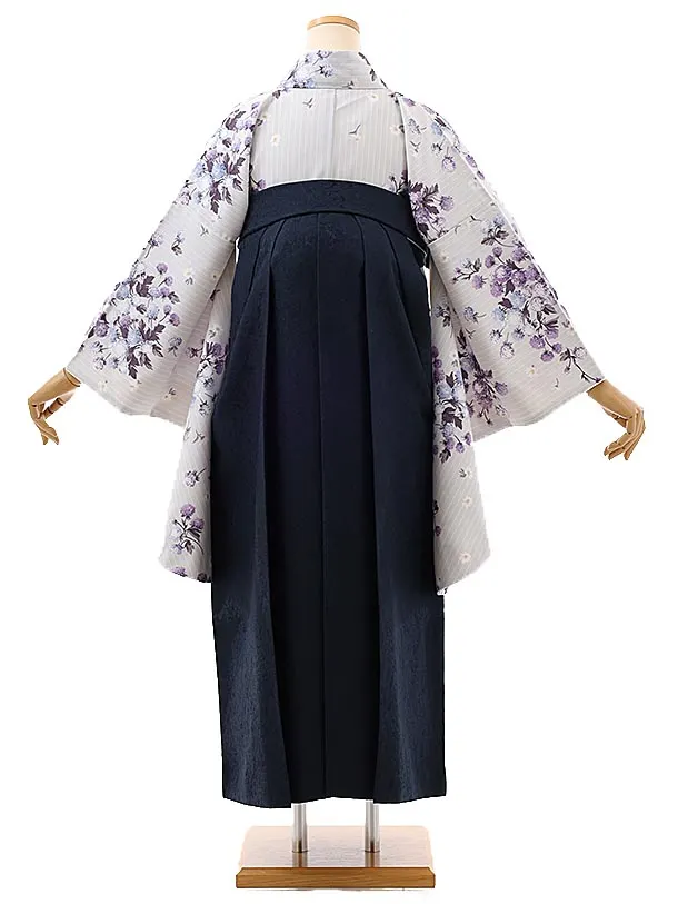 卒業式袴レンタルh783 KamiShibai グレー小花×紺ジャガード袴