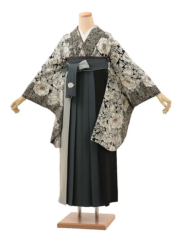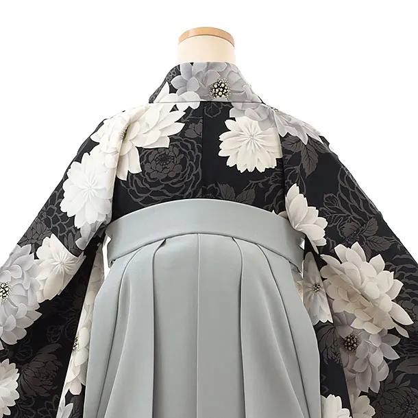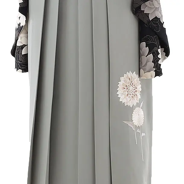 卒業式袴レンタルh815 紅一点 黒地菊×グレー袴