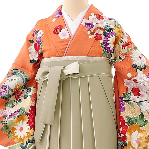卒業式袴レンタルh910 淡オレンジ四季花×ベージュ袴
