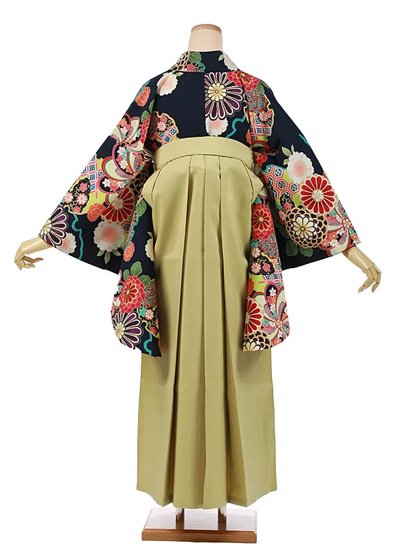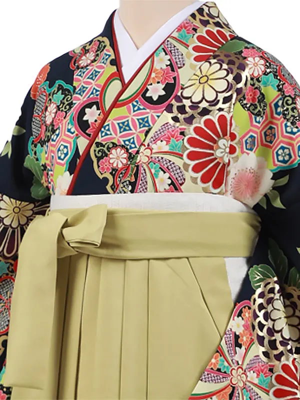 卒業袴レンタルh938 紺地 雪輪菊桜×ライムグリーン袴