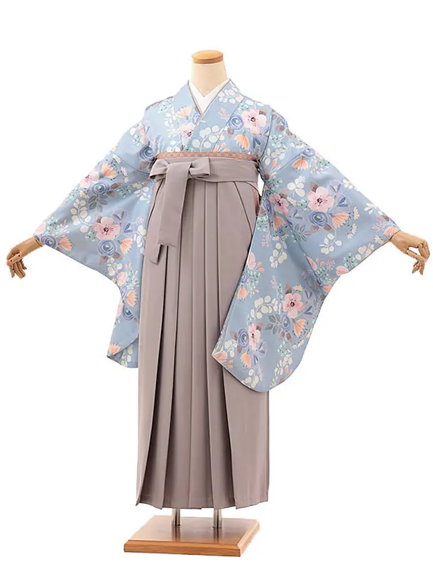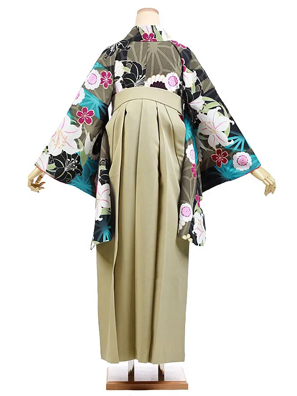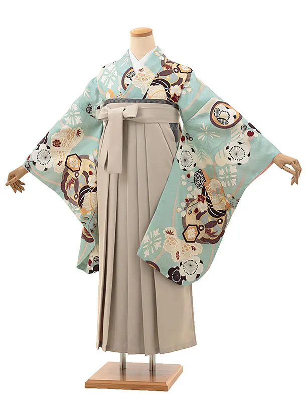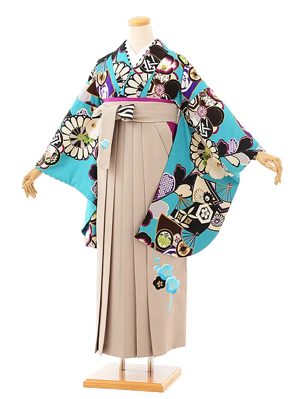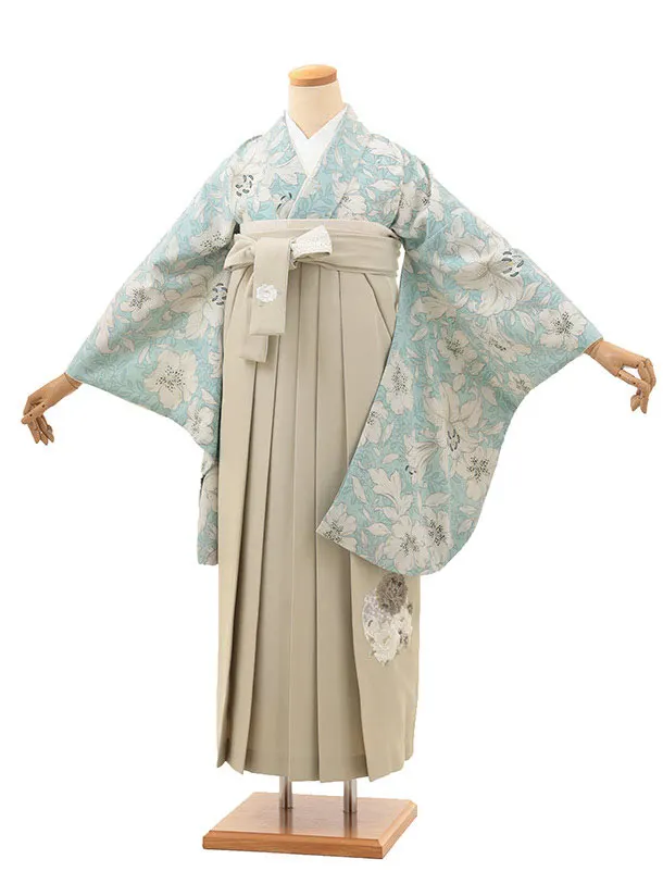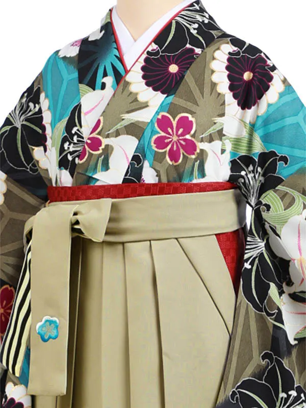 卒業袴レンタルh943 ブルー麻の葉に百合×ベージュ袴