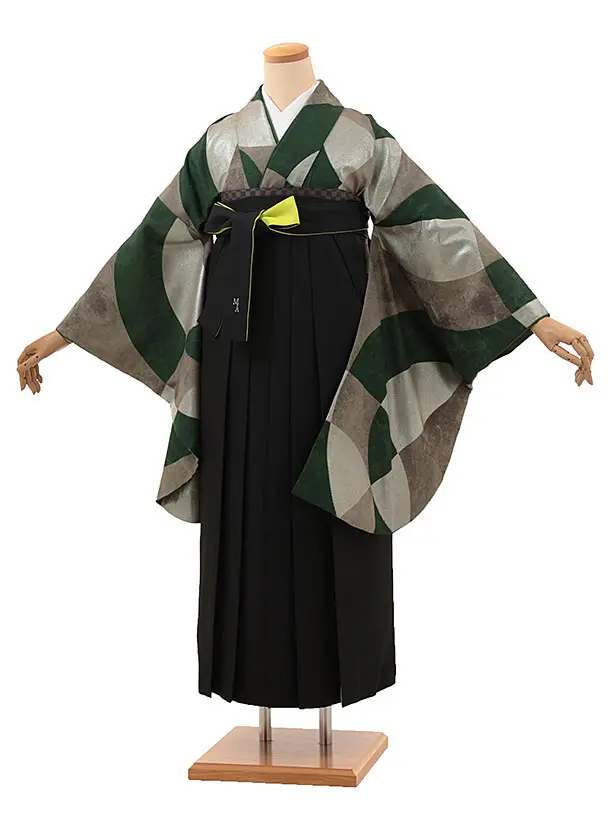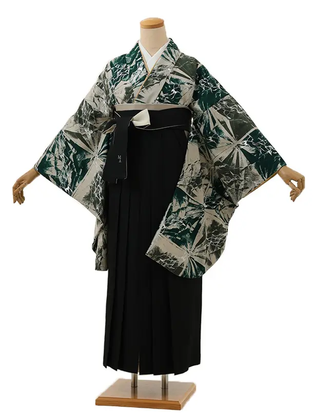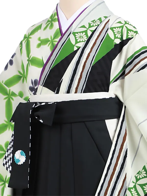 卒業袴レンタルh945 クリーム色アシンメトリー亀甲×黒袴