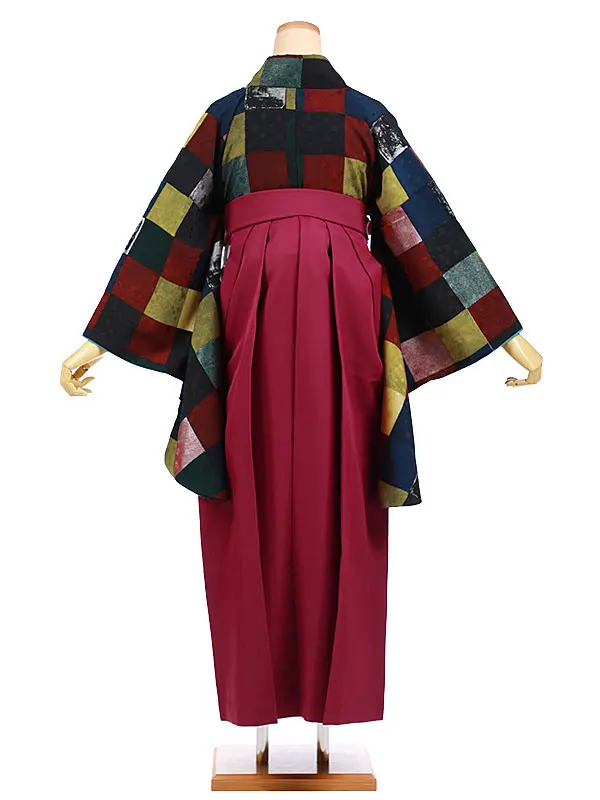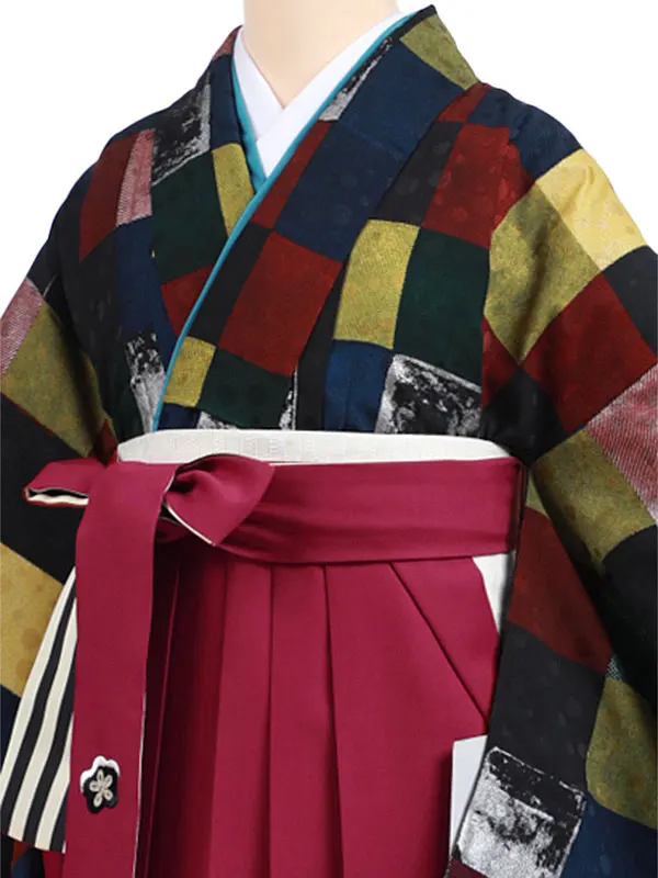 卒業袴レンタルh946 カラフル市松×ボルドー袴