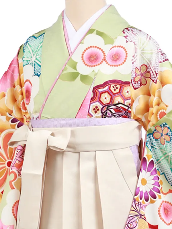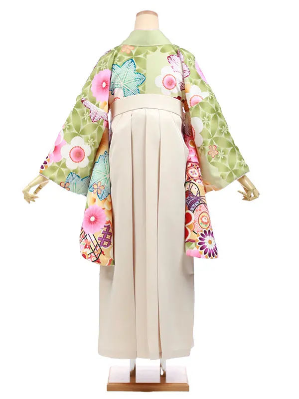 卒業袴レンタルh957 うすグリーン雪輪小槌に花×アイボリー袴