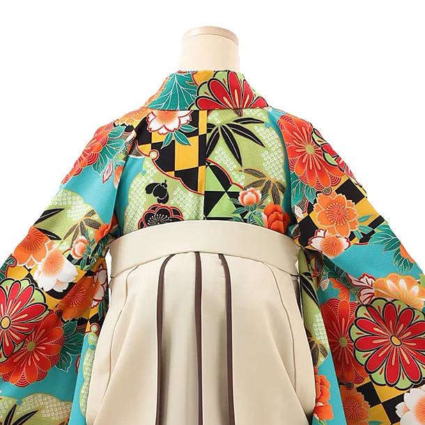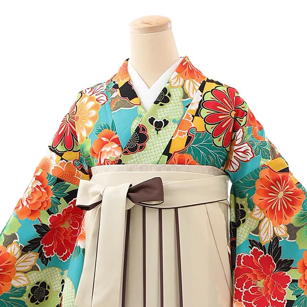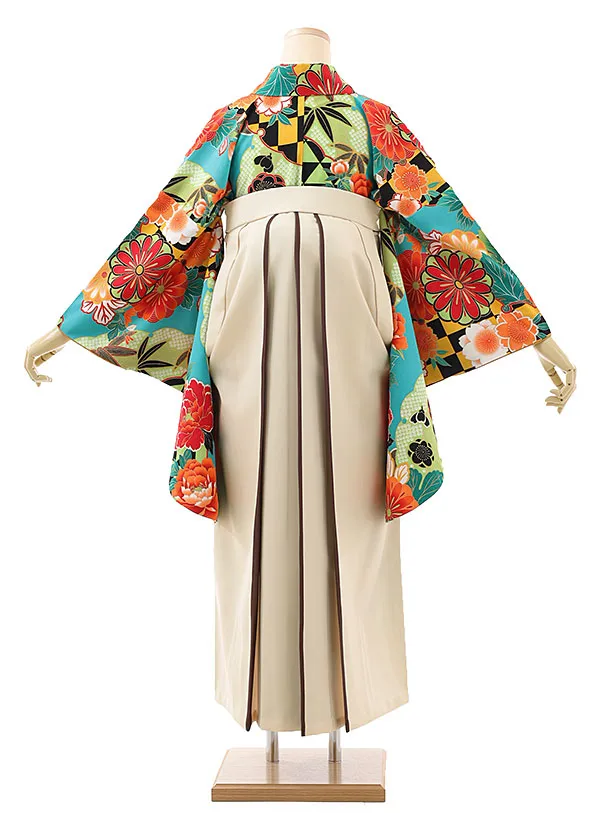 卒業袴レンタルh996 ターコイズ花×ベージュ袴