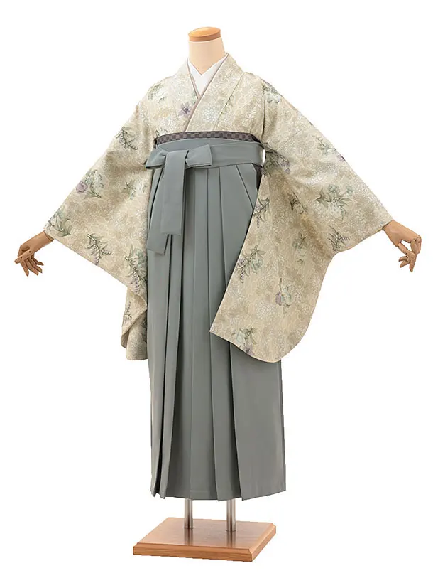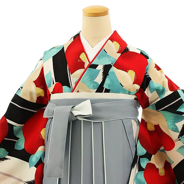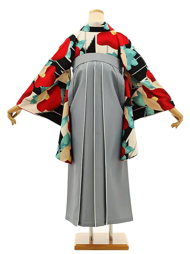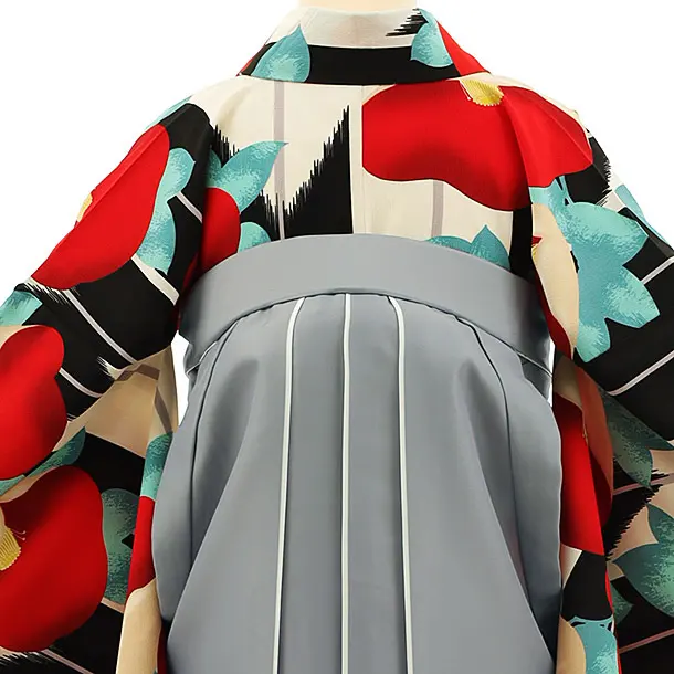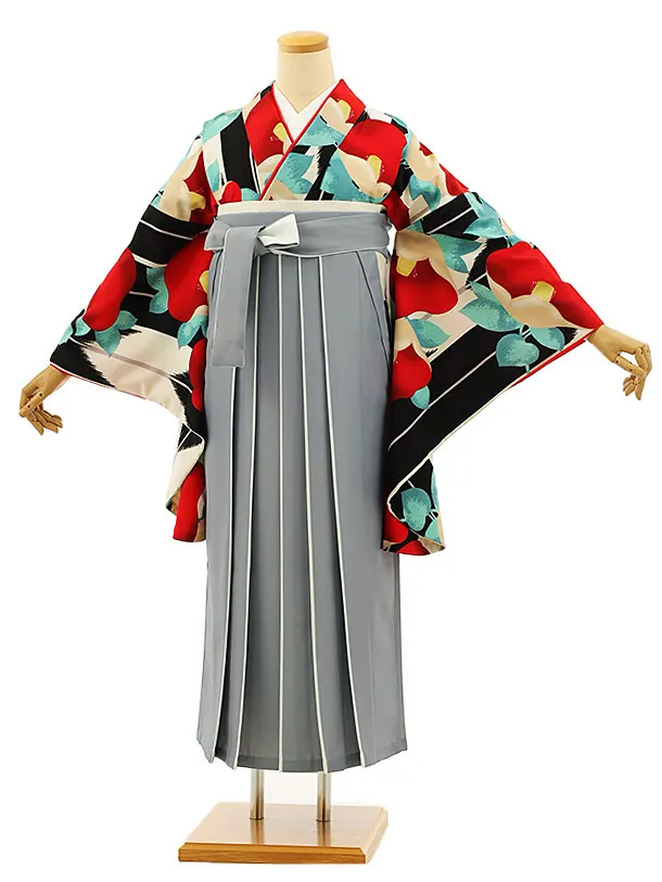 卒業袴レンタルh1025 紅一点アイボリー黒矢柄椿×グレー袴