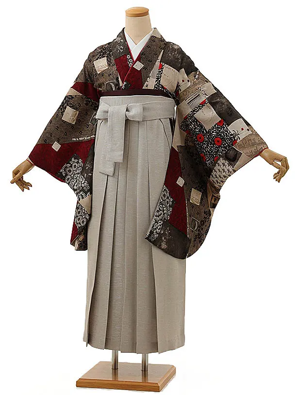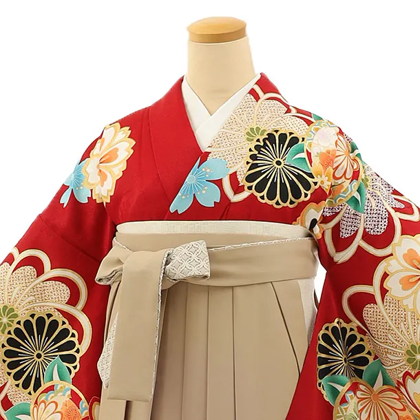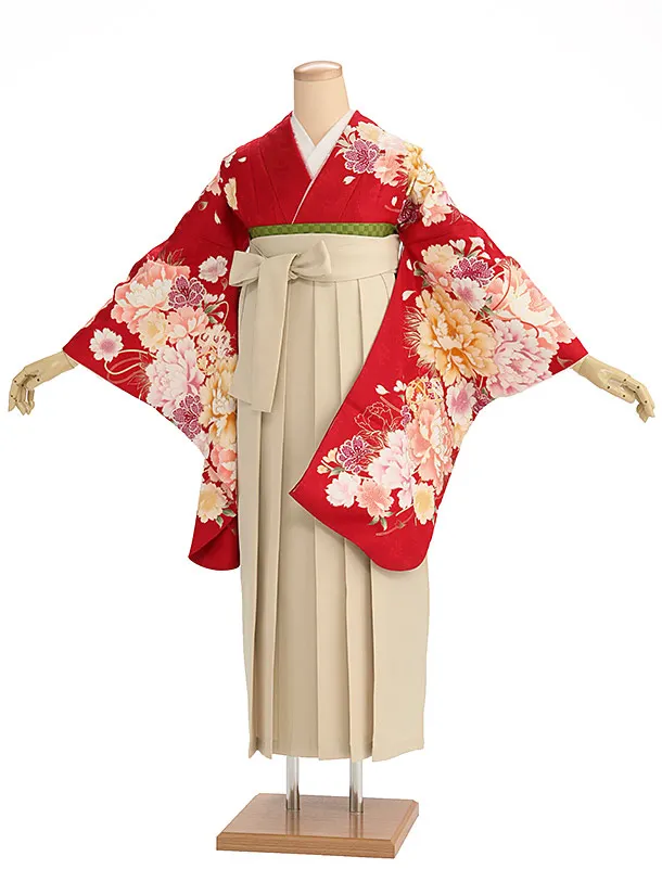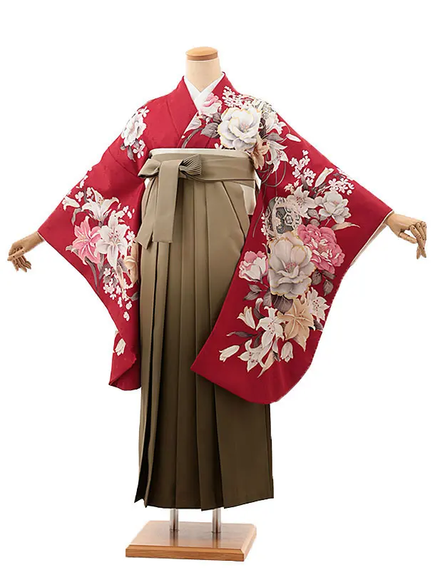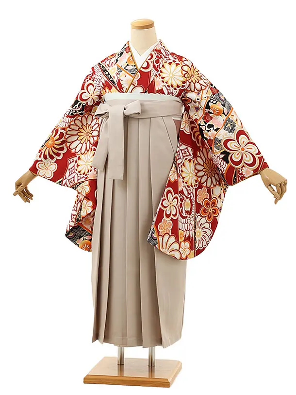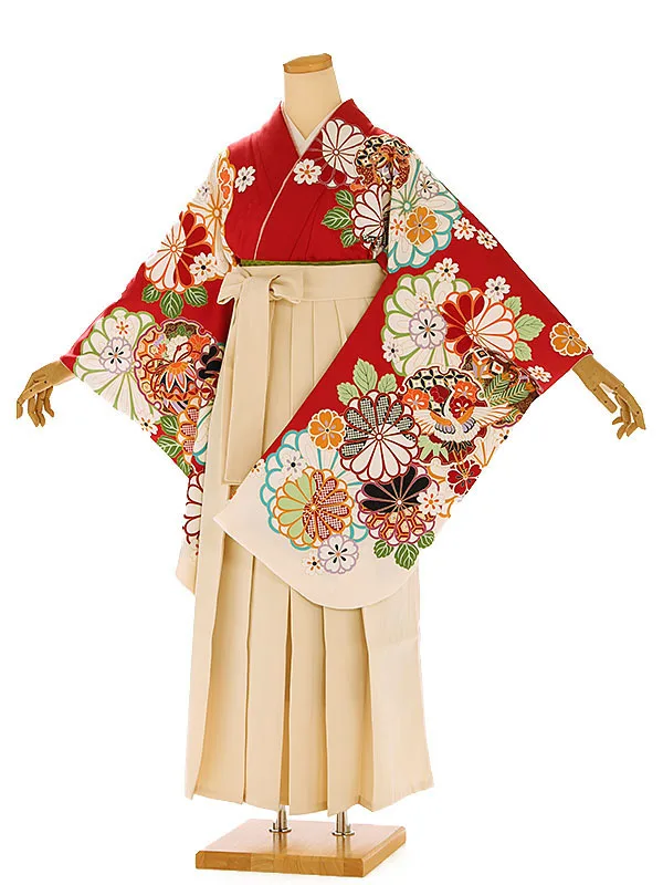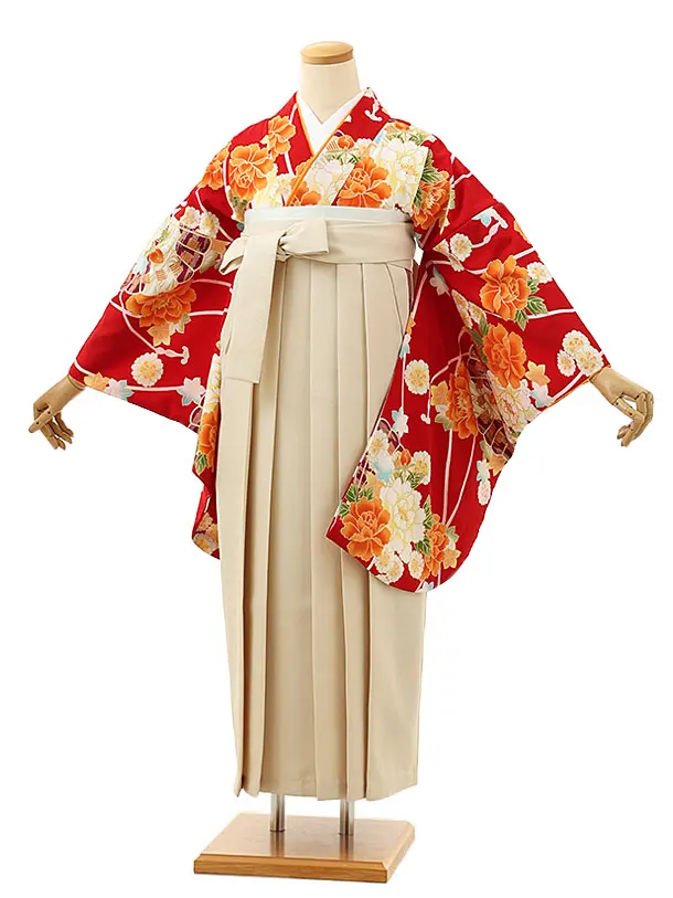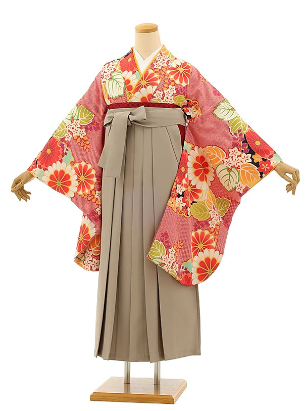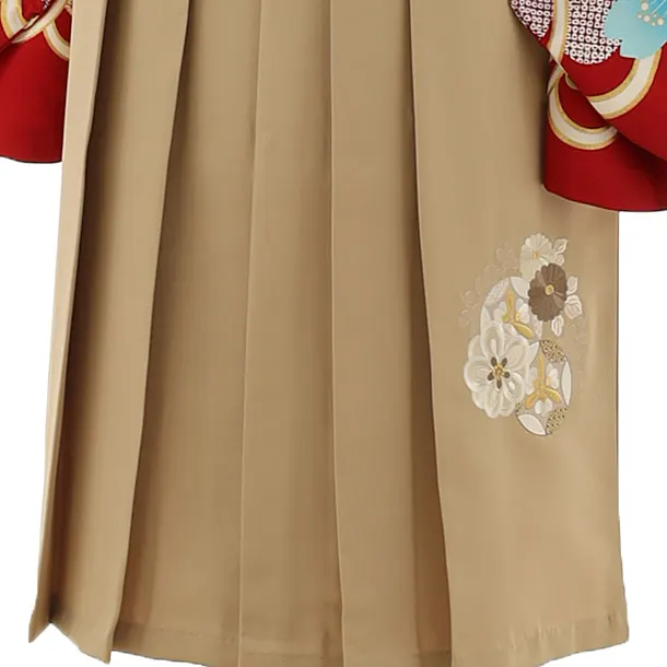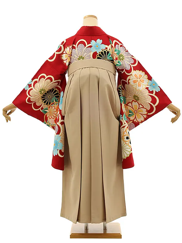卒業式袴レンタル h1139 赤地 菊桜×ベージュ袴