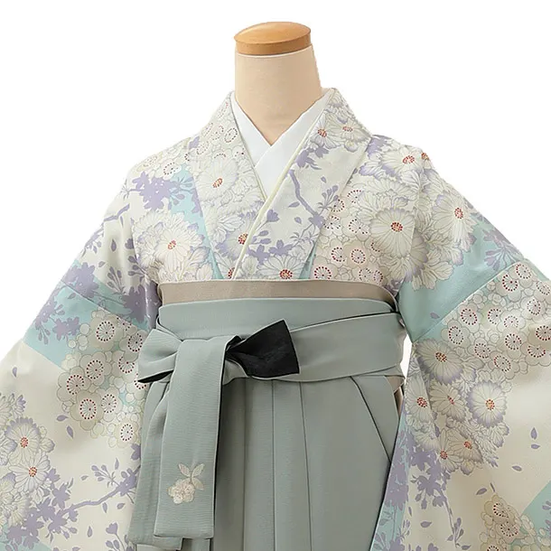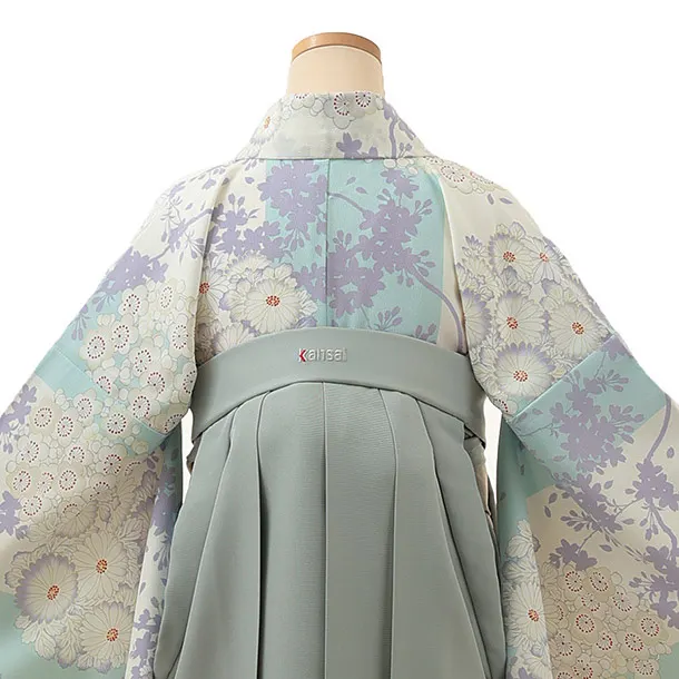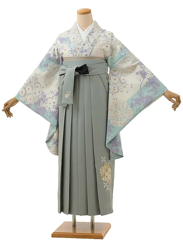 卒業式袴レンタル1255 Kansai 縞に梅菊白水色xグレー