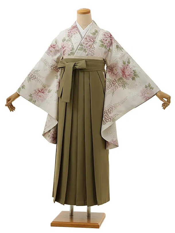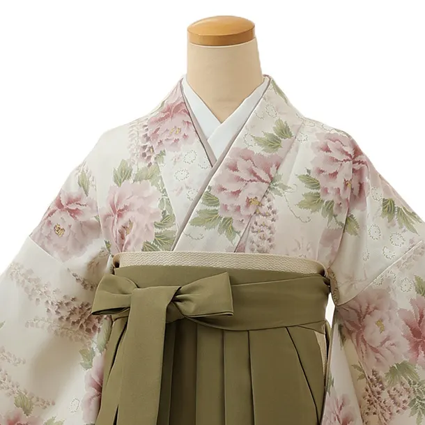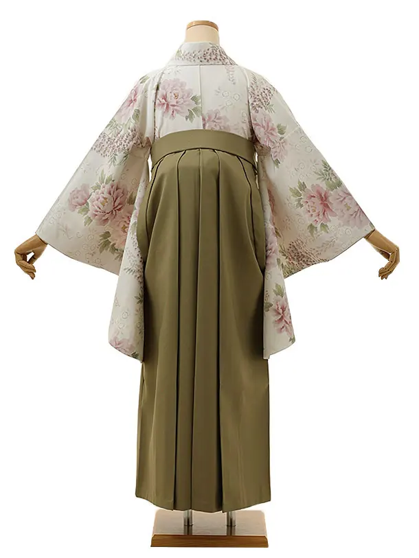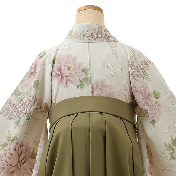 卒業式袴レンタル1343 オフホワイト芍薬x抹茶グリーン