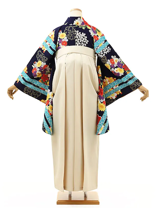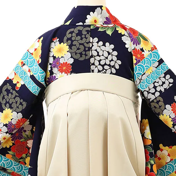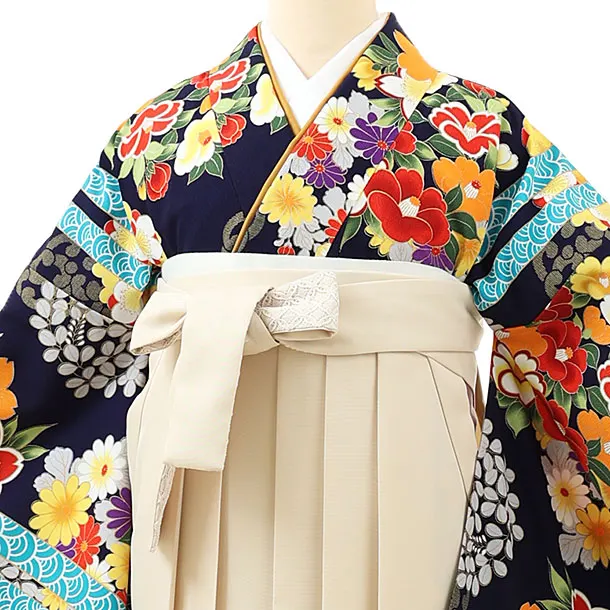 卒業式袴レンタル1592紺地青海波に花xベージュアイボリー