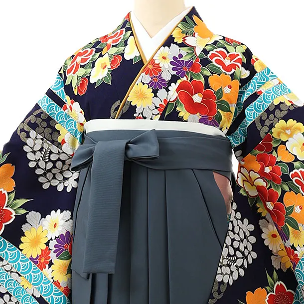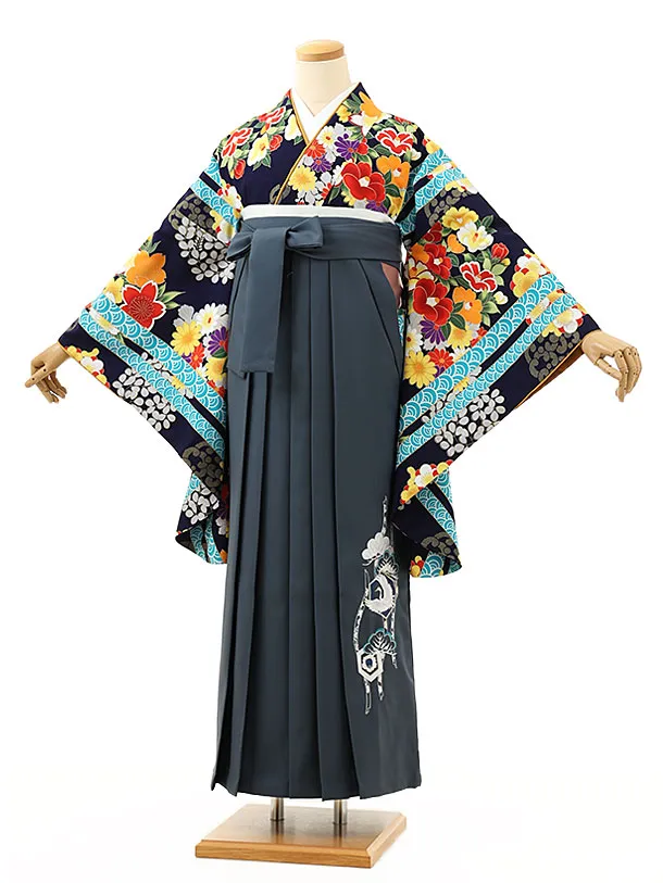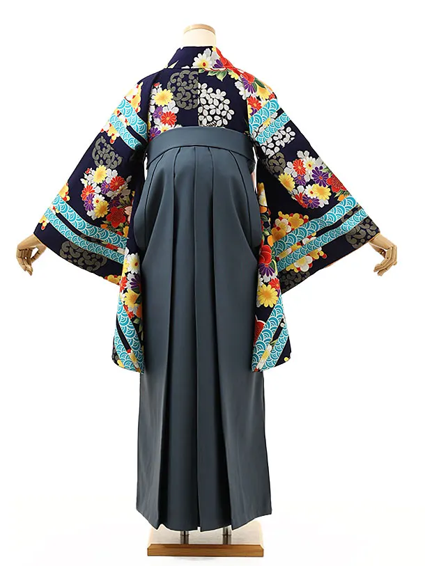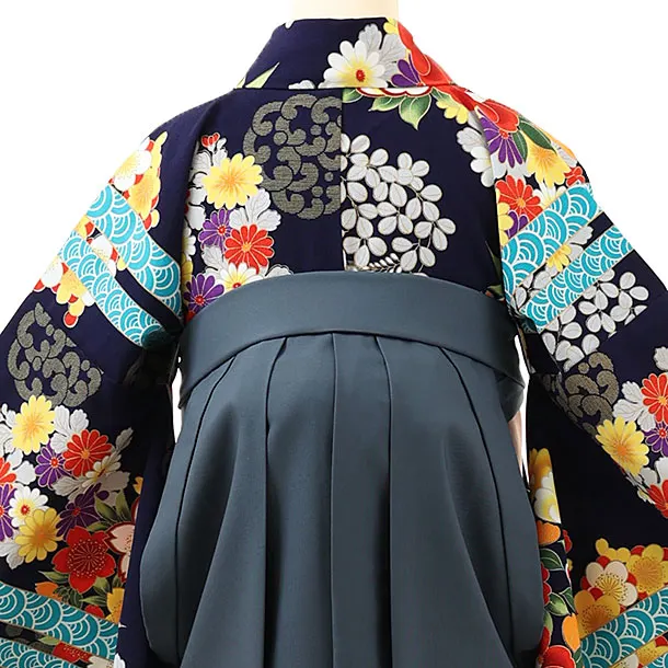 卒業式袴レンタル1593紺地青海波に花xグレー