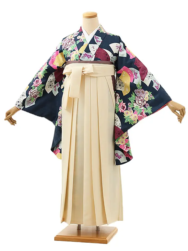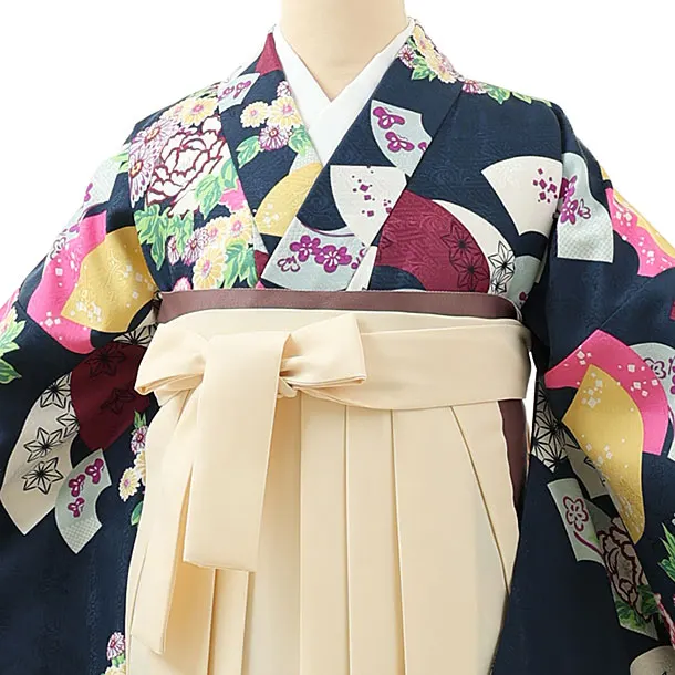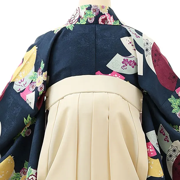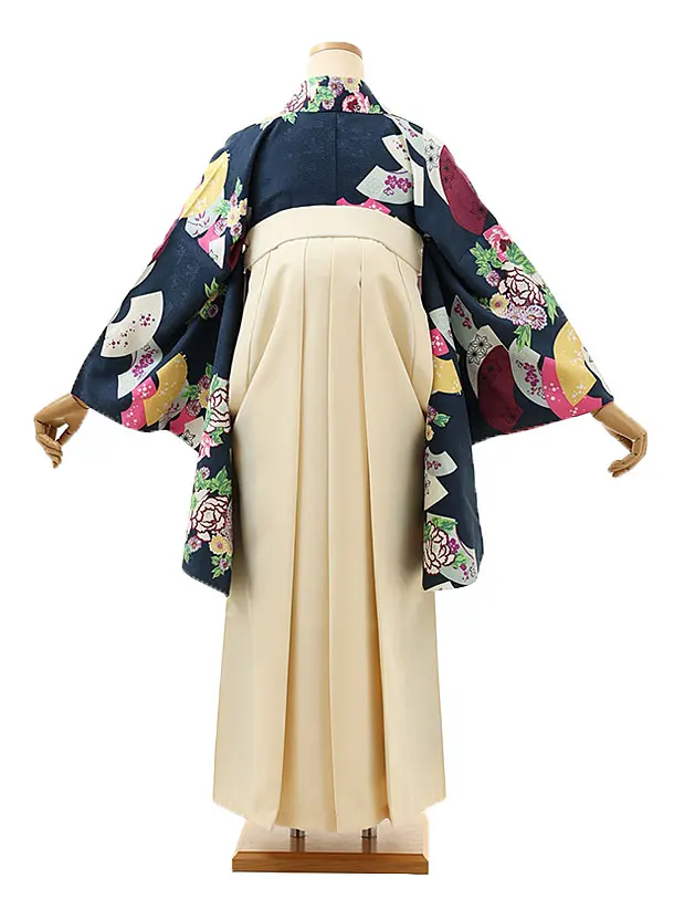 卒業式袴レンタル1615 ダークグリーン扇に花×クリーム