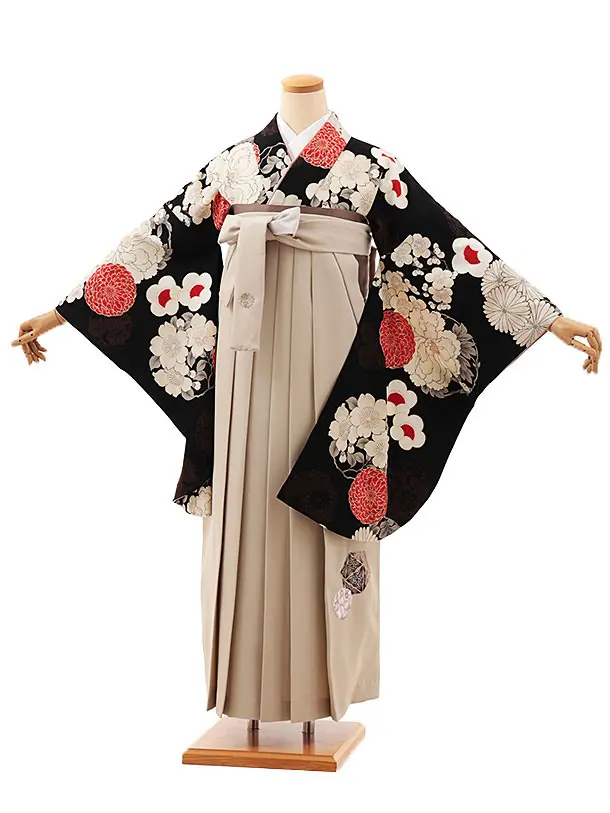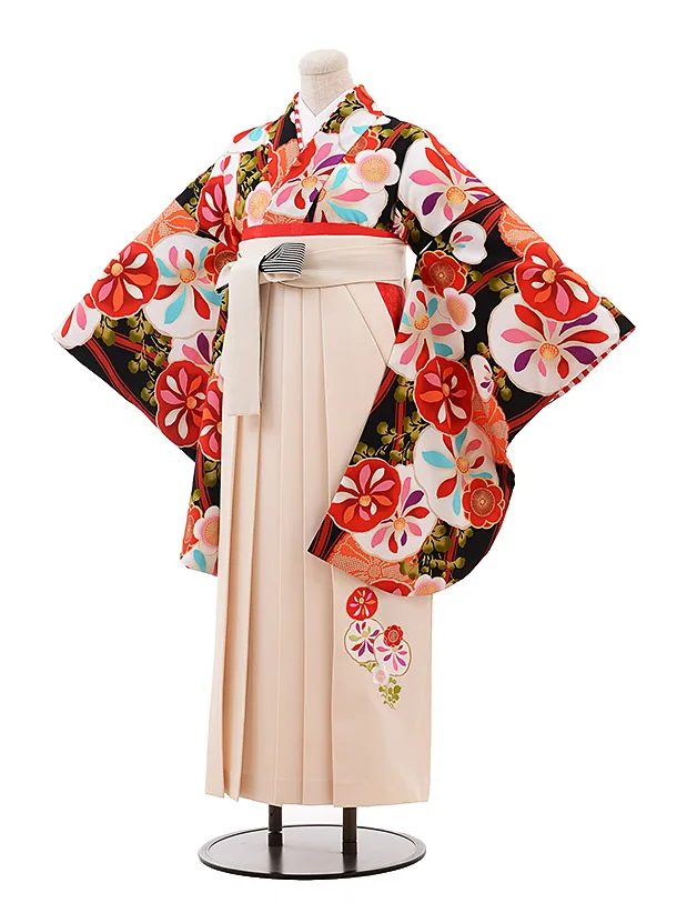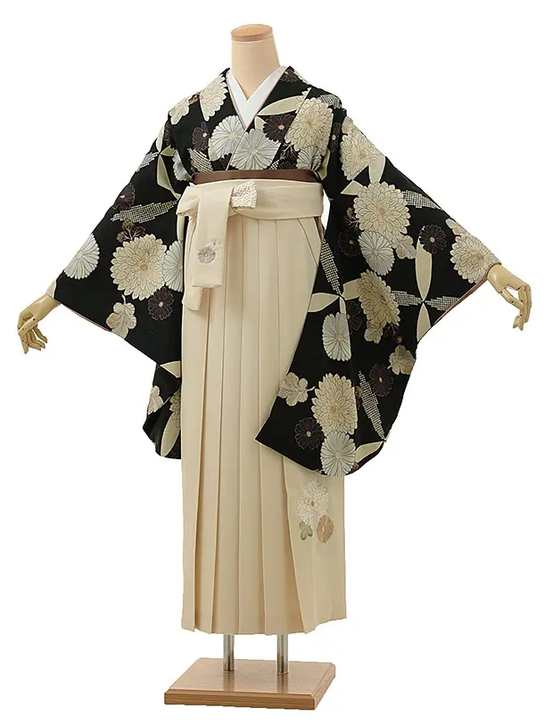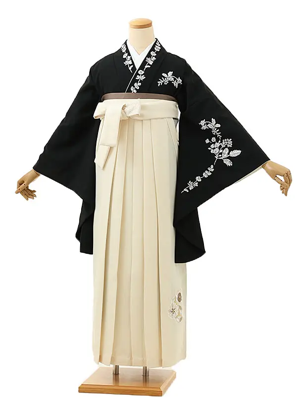 卒業式袴レンタル1709 黒地刺繍花×クリーム