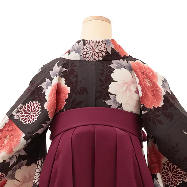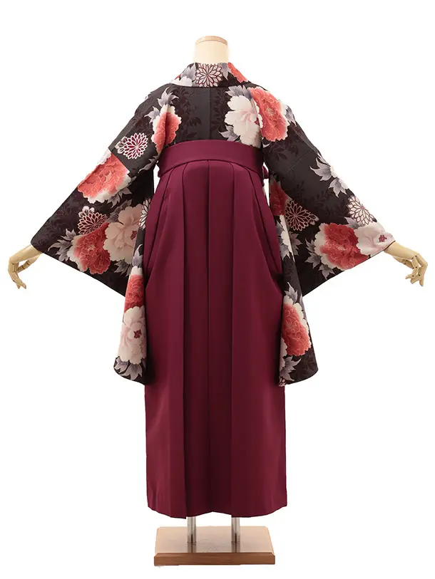 卒業式袴レンタル 1818 九重 藤と牡丹(焦茶)×藤牡丹刺繍(エンジ)