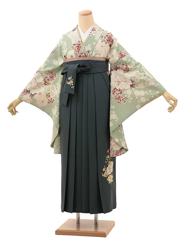 卒業式袴レンタル1866 Kansai ペールグリーン梅花xブルーグレー