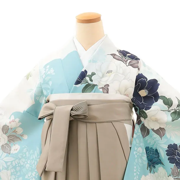 卒業袴T056 水色 椿牡丹×モカベージュぼかし