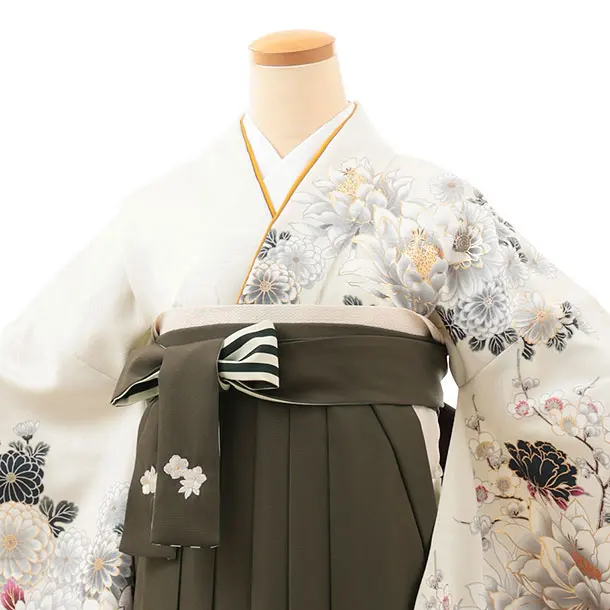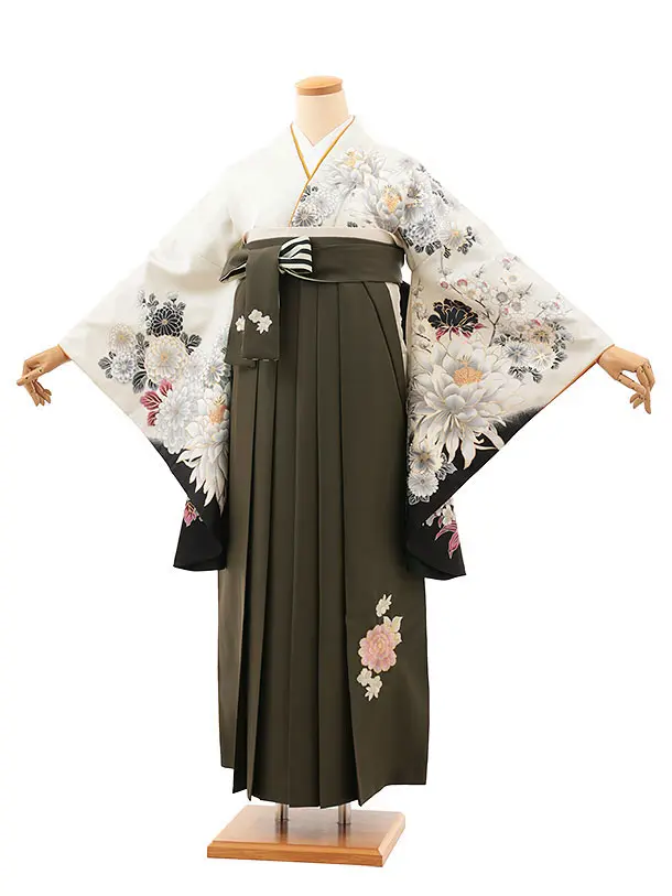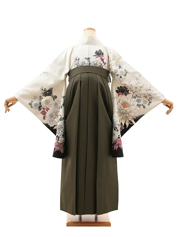 卒業袴T065 アイボリー裾黒花づくし×カーキ