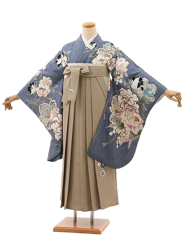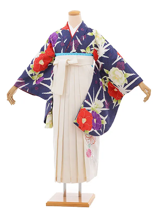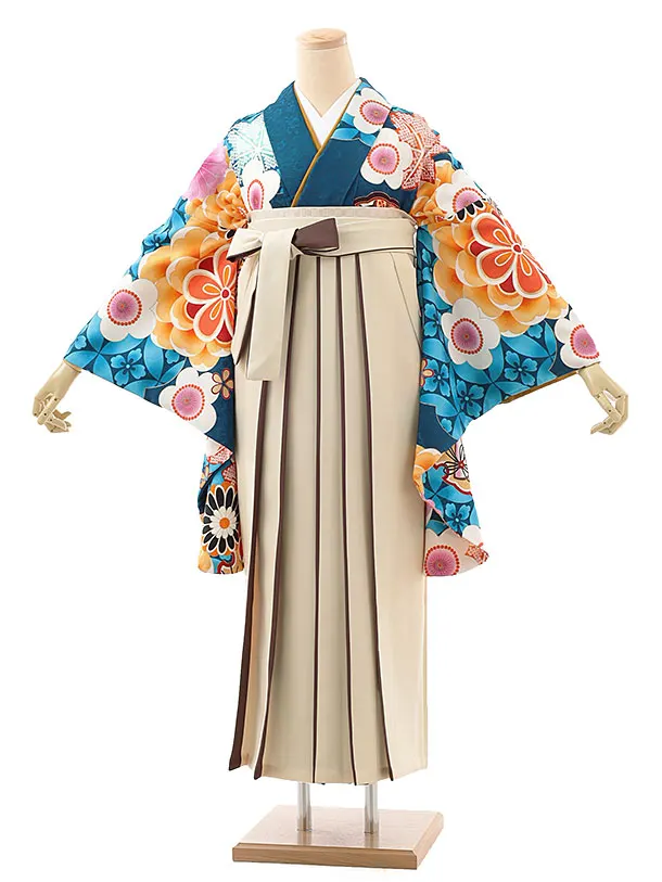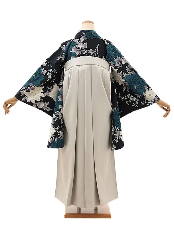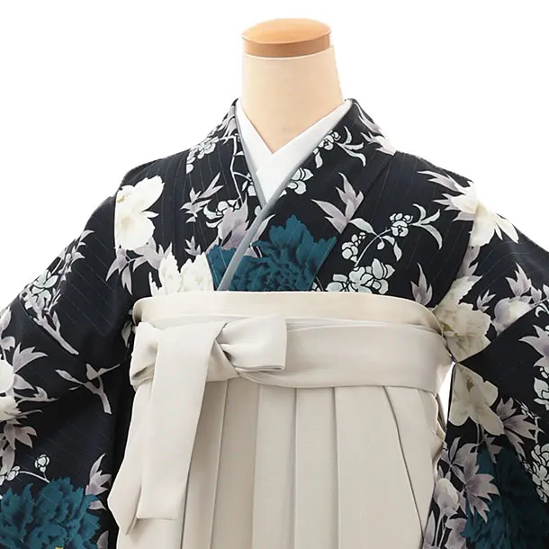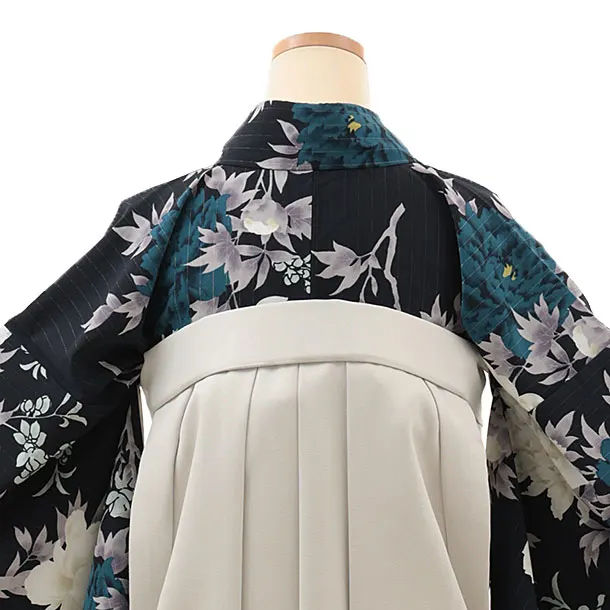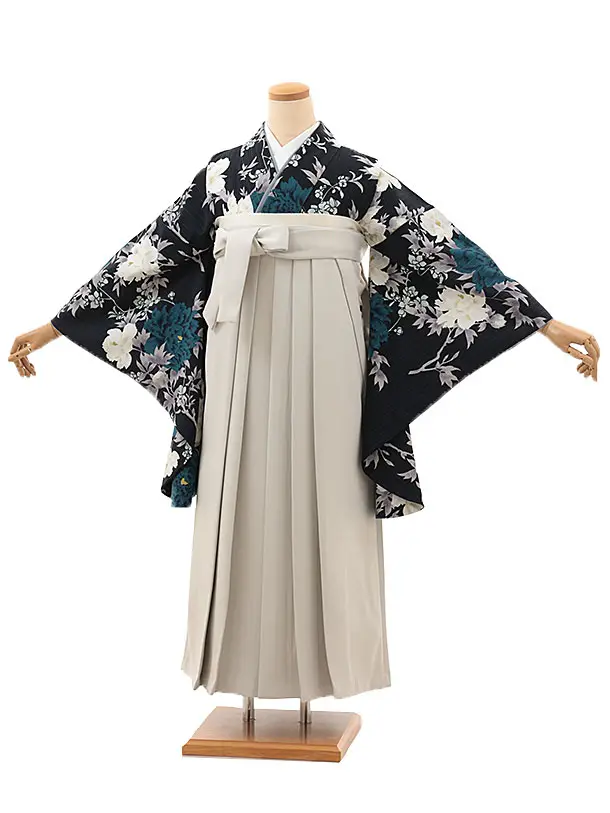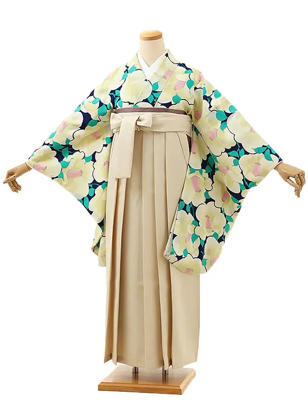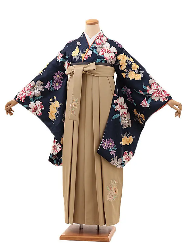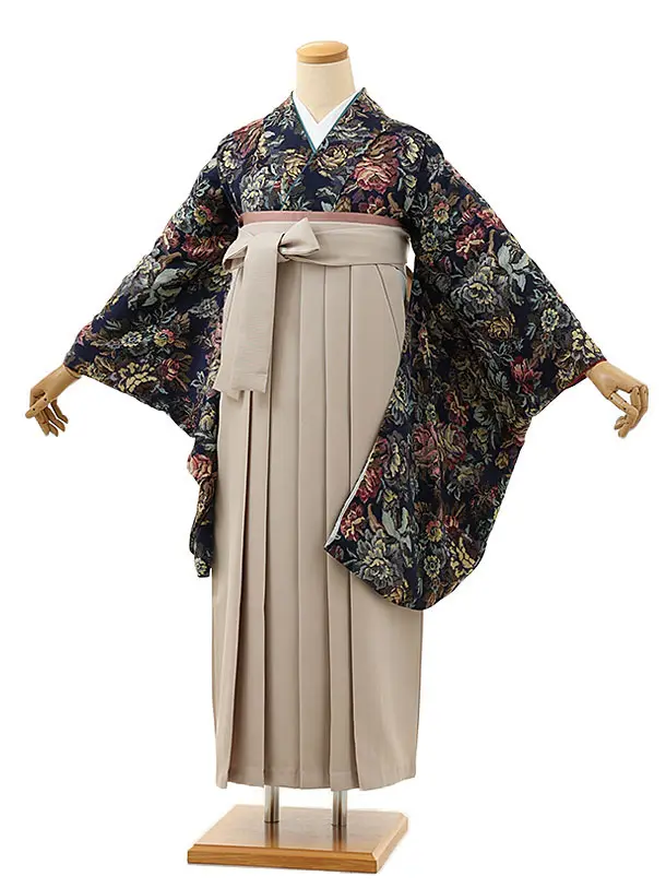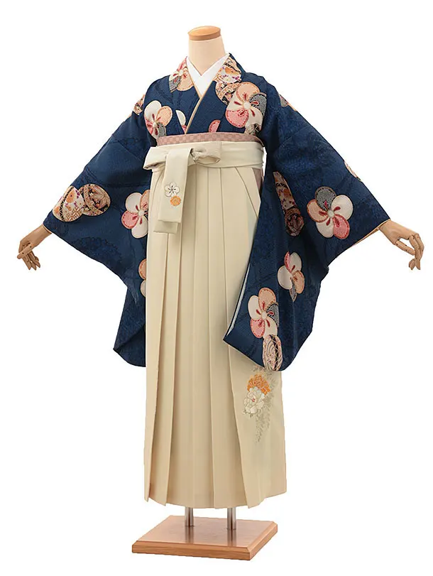 卒業袴T087 紺銀通し花×薄ベージュ レザー調