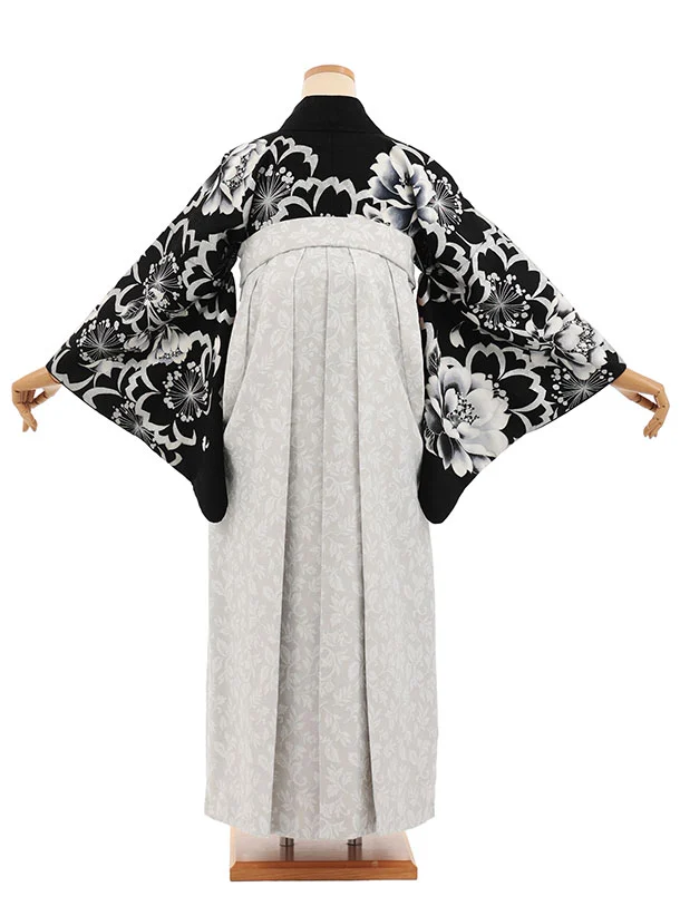 先生,教員向け袴レンタルT244 黒地牡丹×薄グレー花