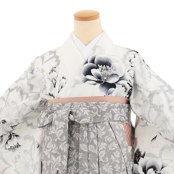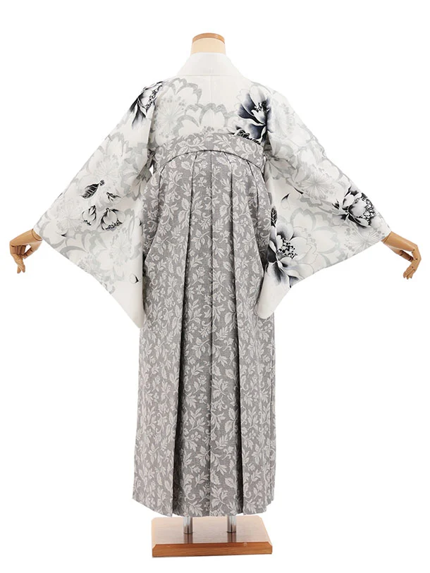 先生,教員向け袴レンタルT245 白地牡丹×グレー花