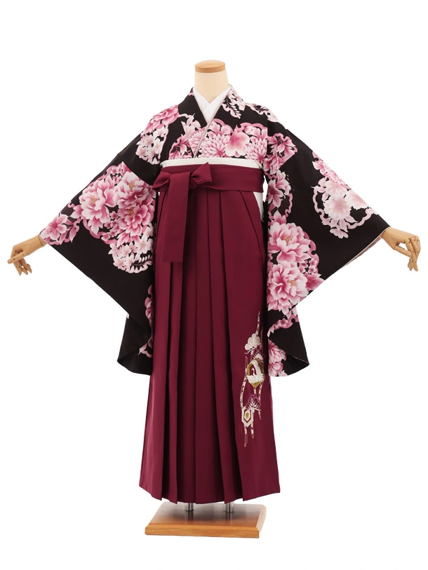 先生,教員向け袴レンタルT291黒地雪輪花×ワイン