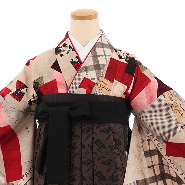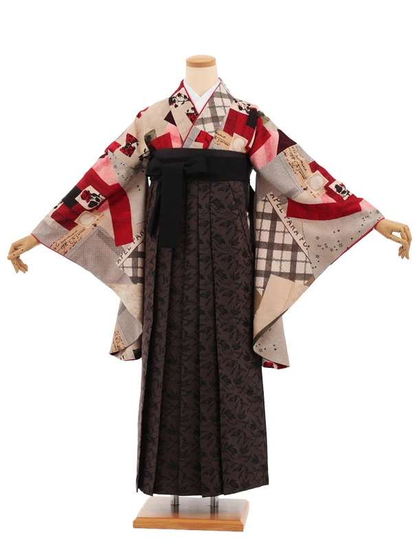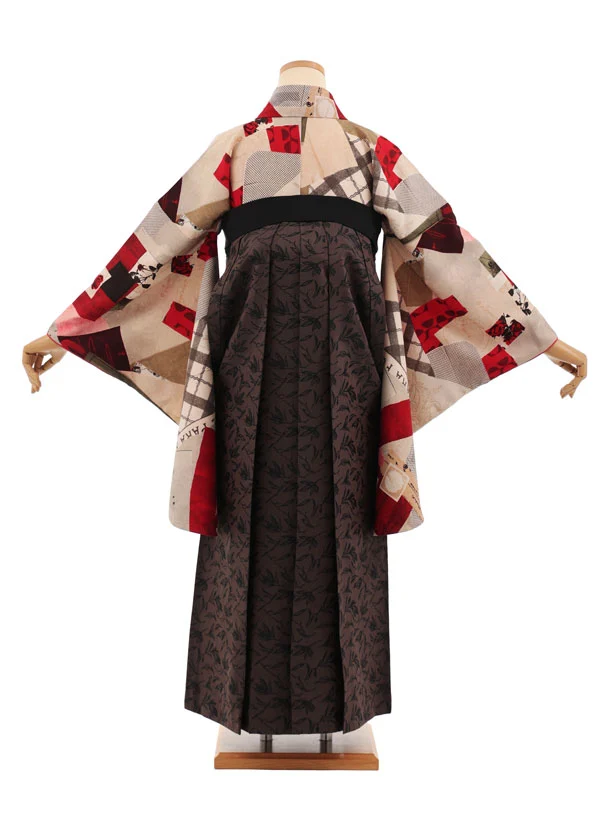 卒業袴T317星間バラベージュ赤×ブラウンリーフ