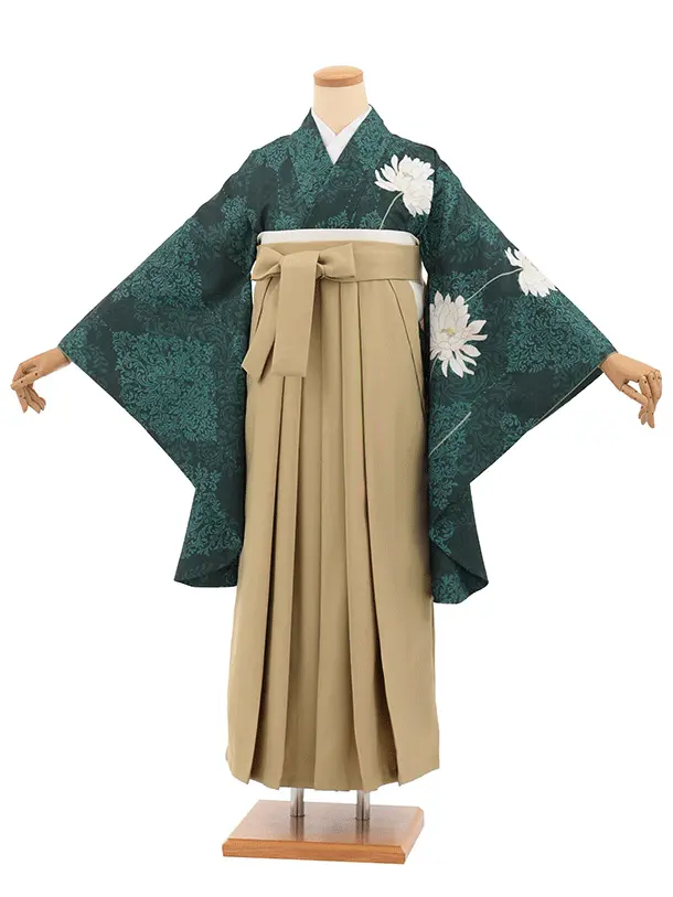 先生,教員向け袴レンタルT328グリーンダマスク柄に花×モカベージュ
