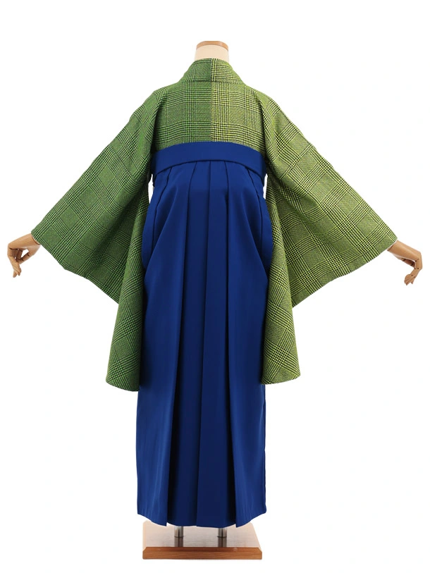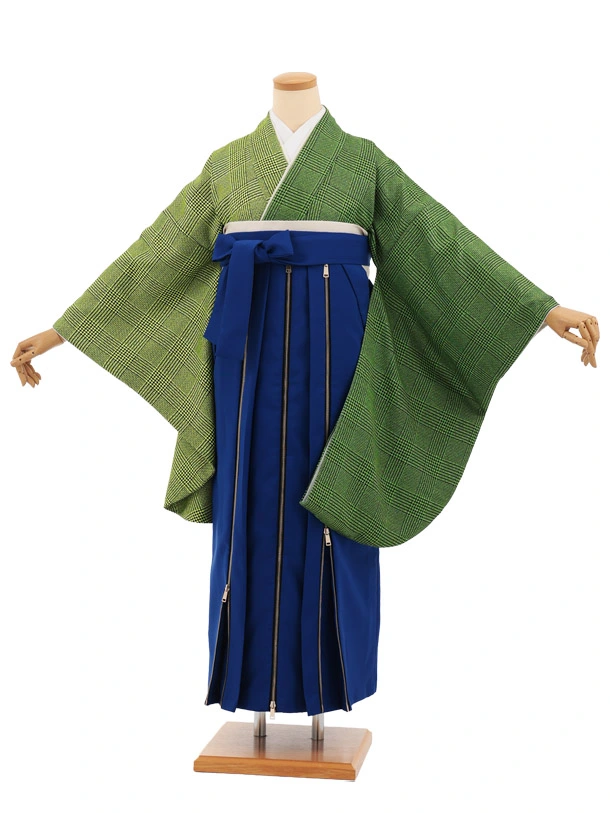 卒業袴T368 緑片身替りツィードグレンチェック×ブルーかざりファスナー付き