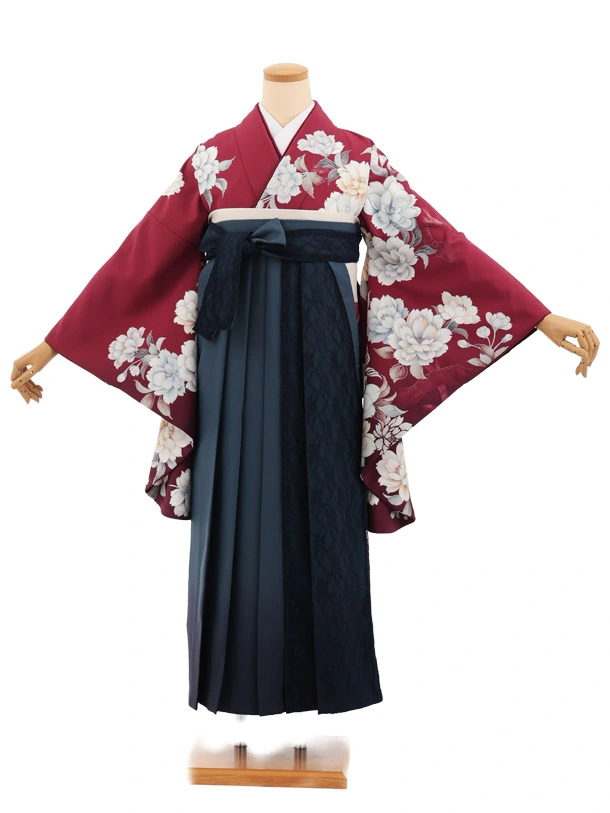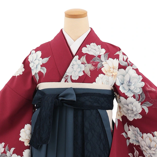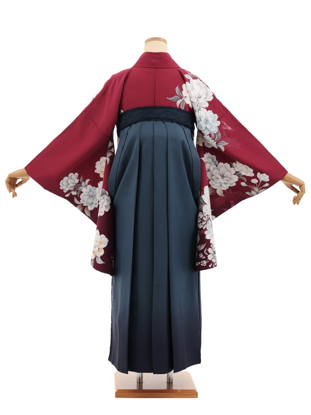 卒業式袴レンタルT415 ボルドー花×グレイッシュブルーレース