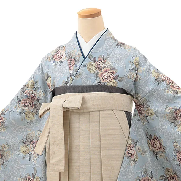 卒業式袴レンタルV006 ブルーグレーダマスク柄花×アイボリー