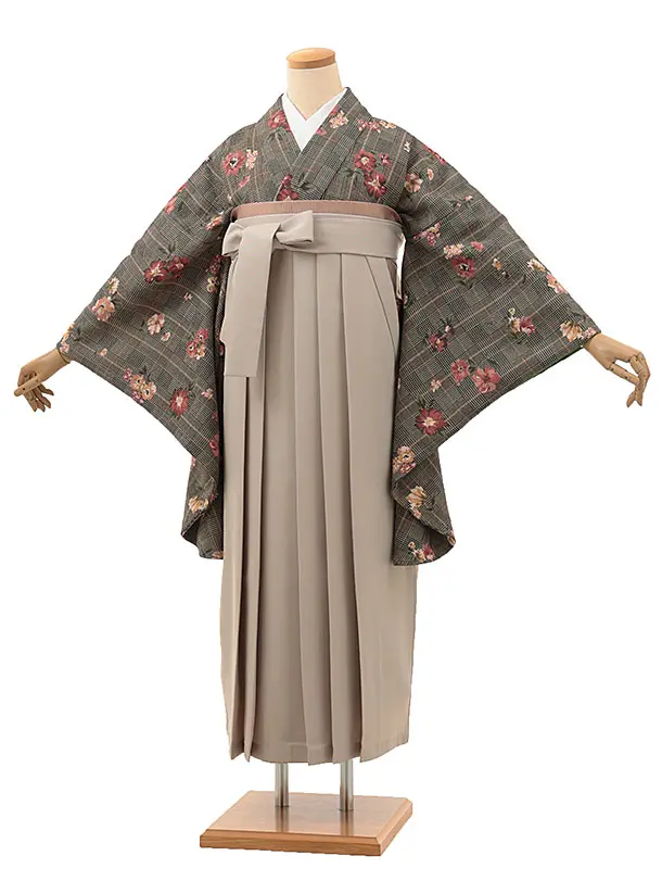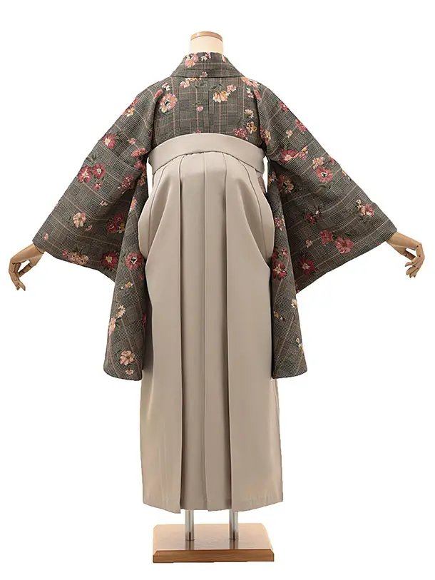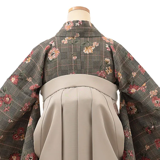 卒業式袴レンタルV008 黒グレンチェック花×ベージュ