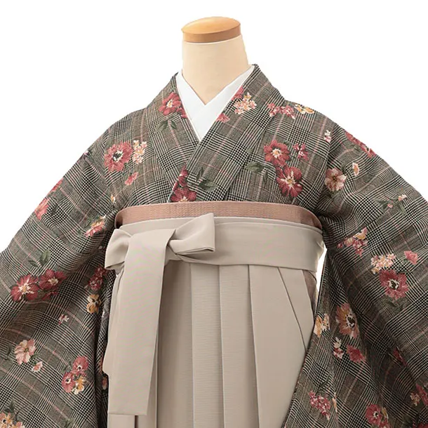 卒業式袴レンタルV009 黒グレンチェック花×ベージュ