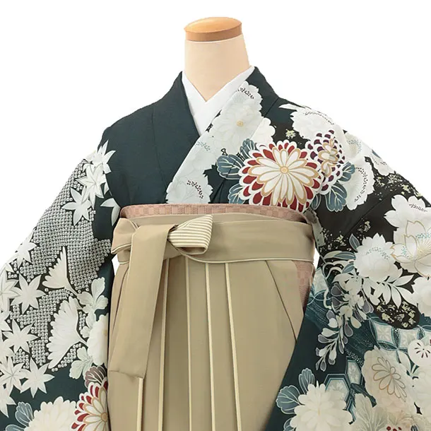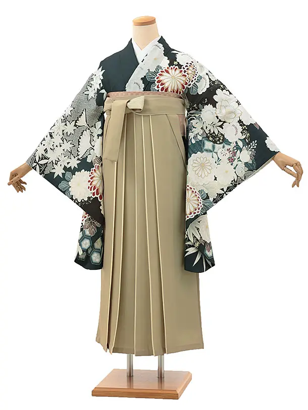 卒業式袴レンタルV011 モスグリーン花づくし×ベージュアイボリー