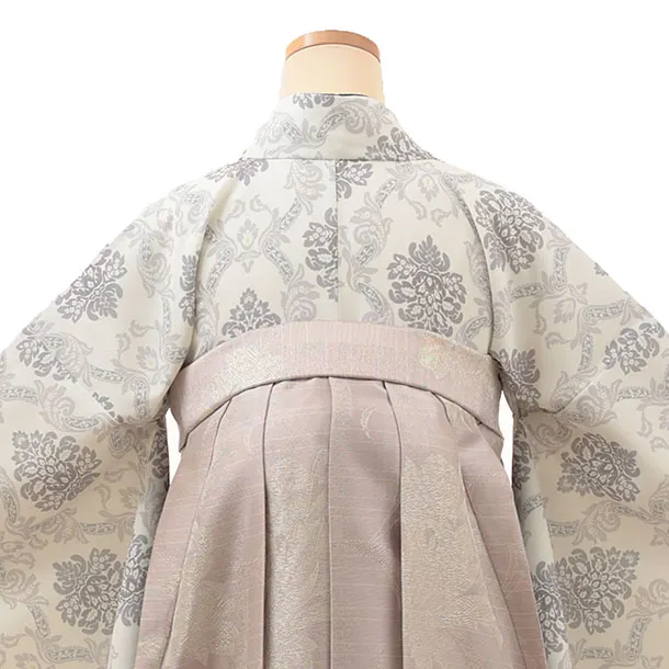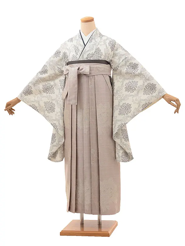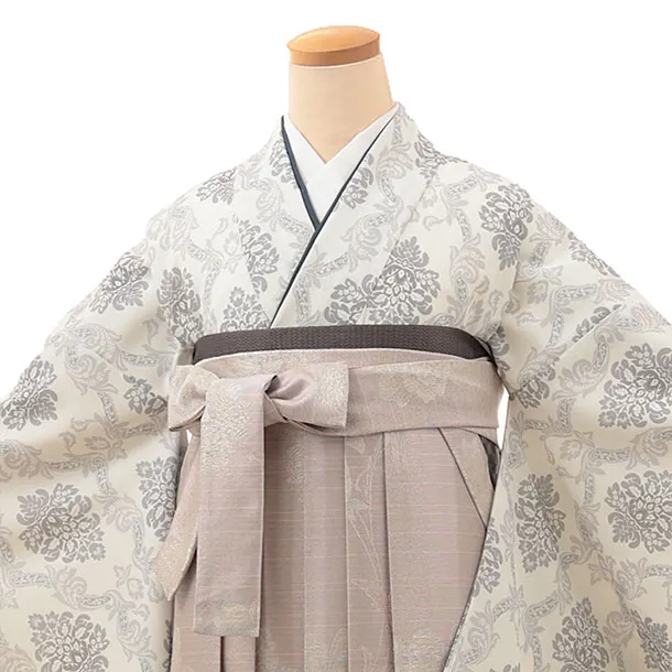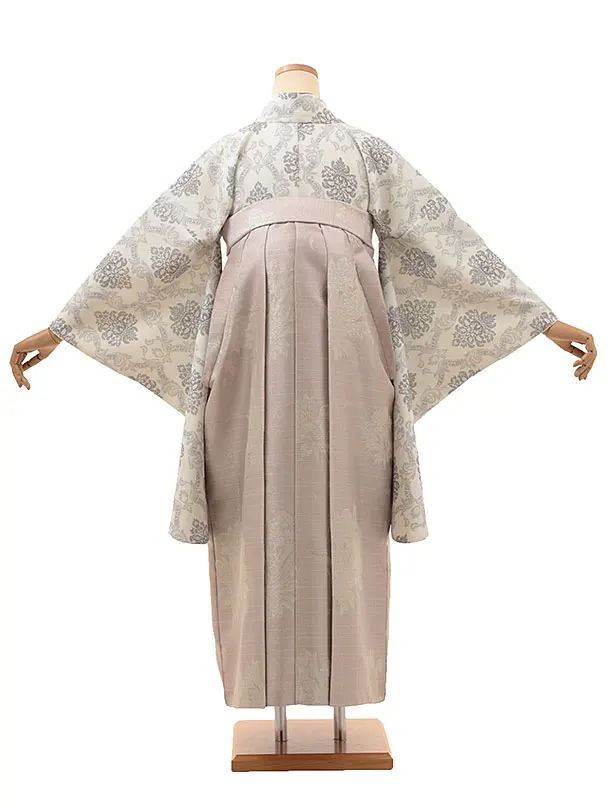 卒業式袴レンタルV013 オフホワイトダマスク柄×ピンクパープルラメ花