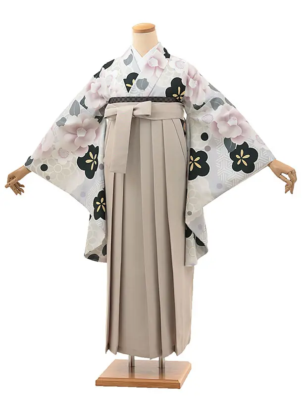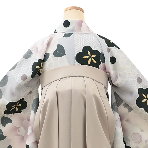 卒業式袴レンタルV068 薄グレー 桜椿×ベージュ