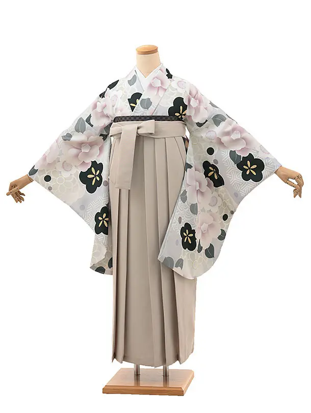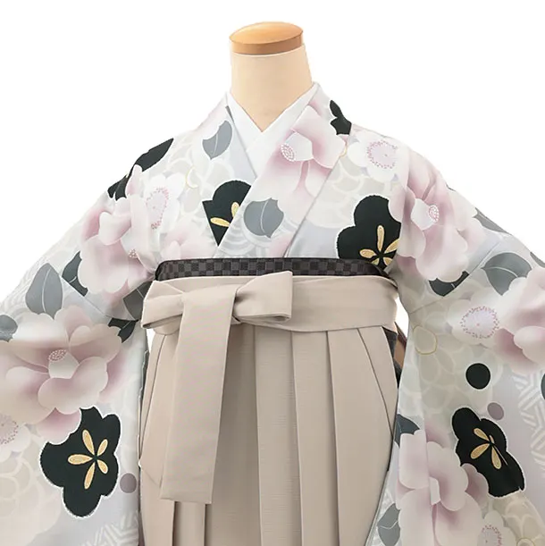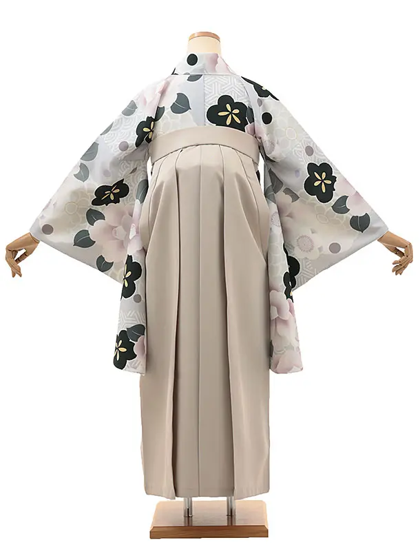 • 卒業式袴レンタルV069 薄グレー 桜椿×ベージュ