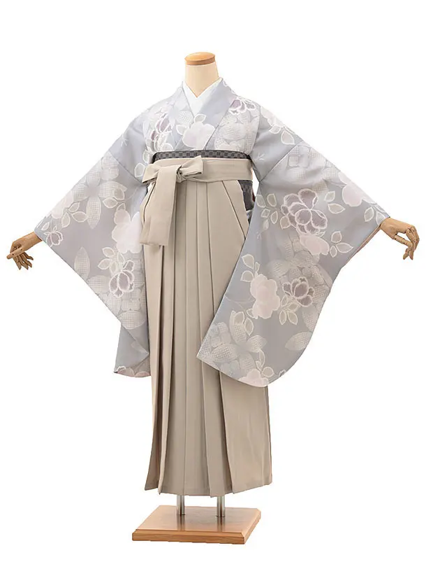 卒業式袴レンタルV069 薄グレー 桜椿×ベージュ