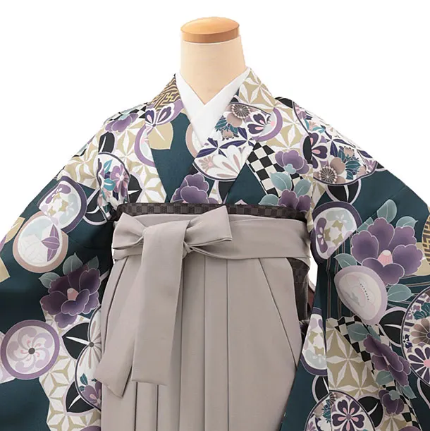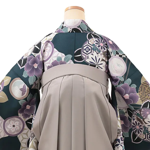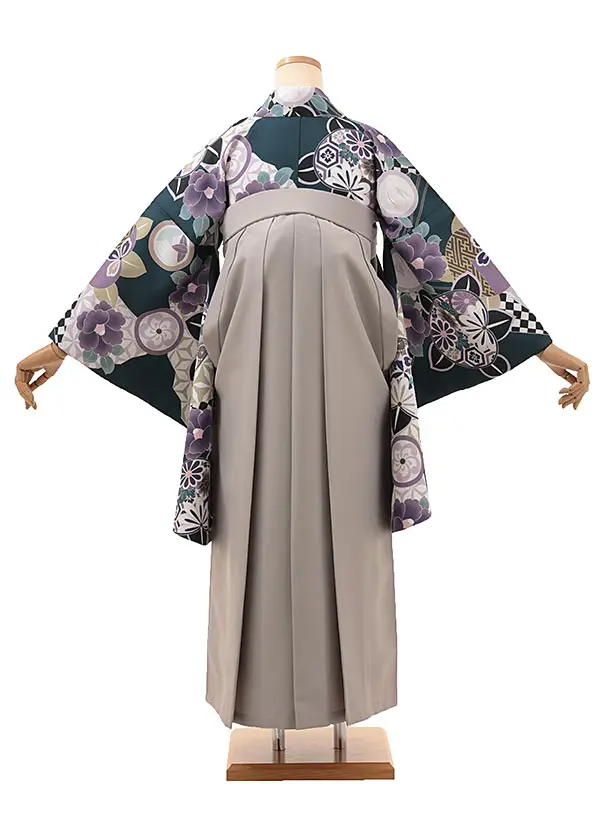 卒業式袴レンタルV087 ブルーグリーン 椿 橘×グレージュ