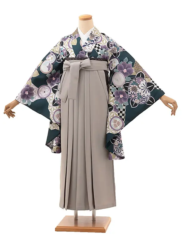 卒業式袴レンタルV088 ブルーグリーン 椿 橘×グレージュ