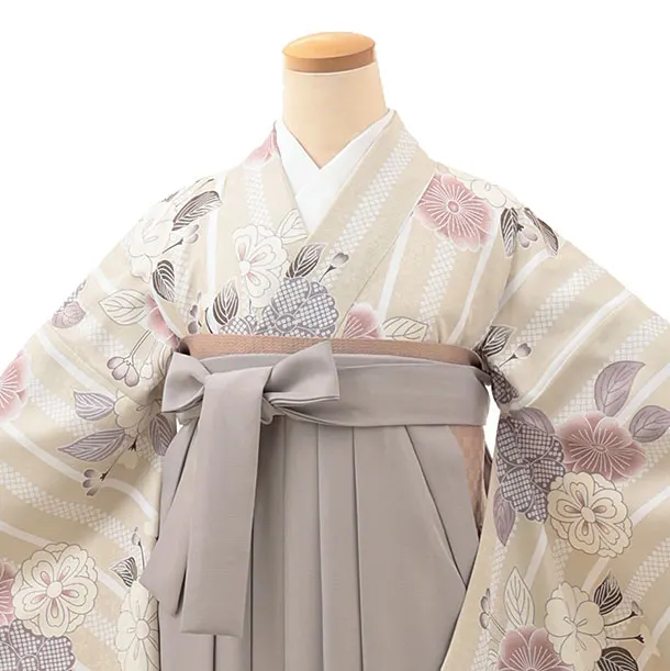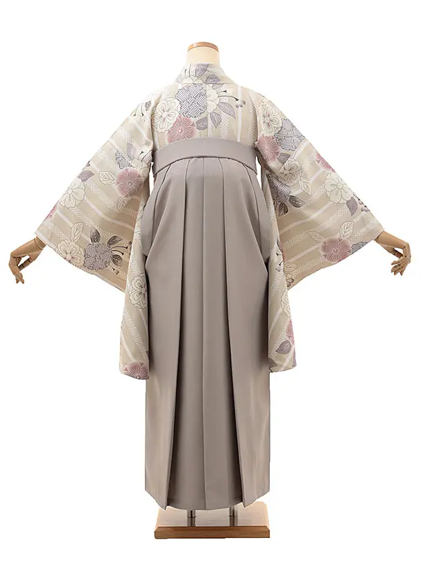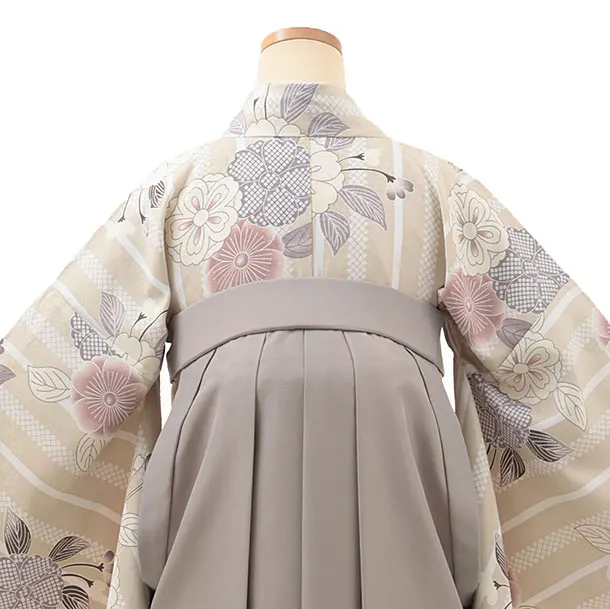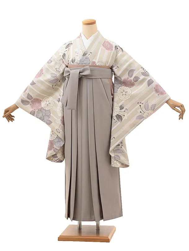卒業式袴レンタルV096 ベージュストライプ 花×グレージュ