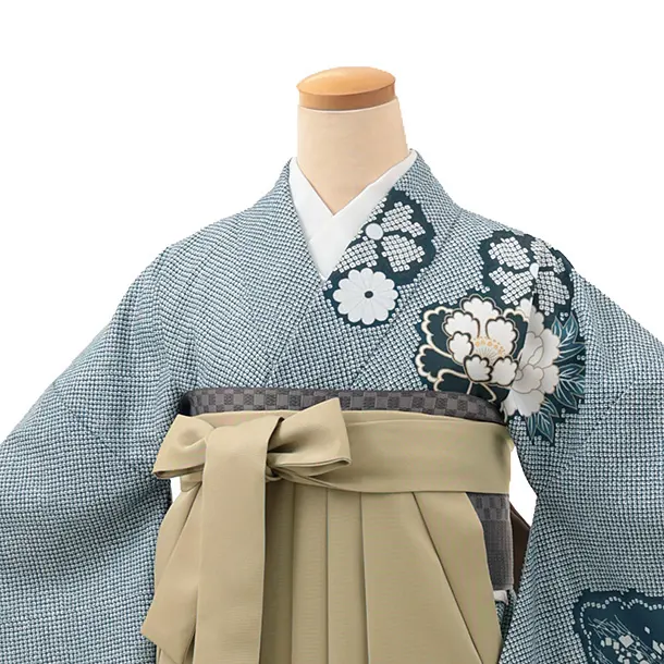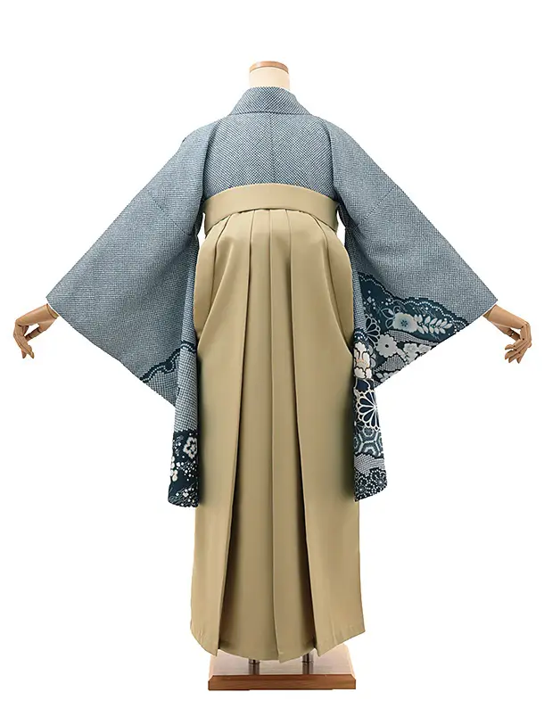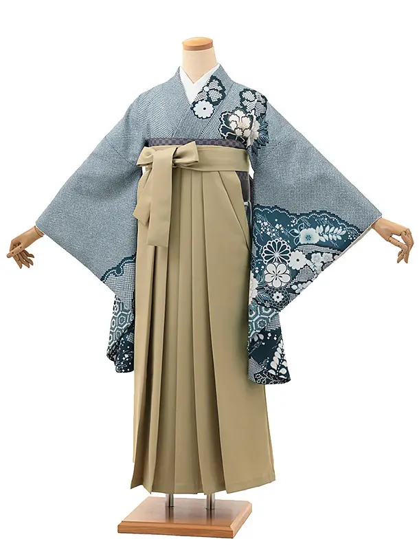 卒業式袴レンタルV128 ブルーグリーン疋田柄 花×キャメルベージュ