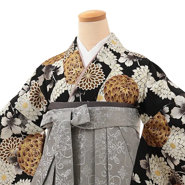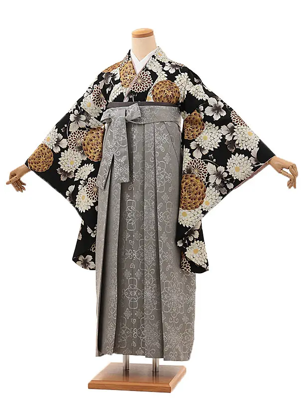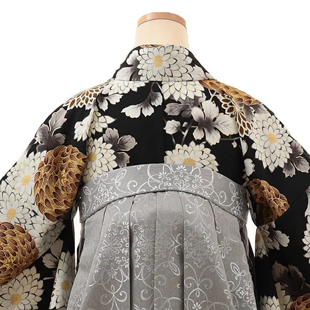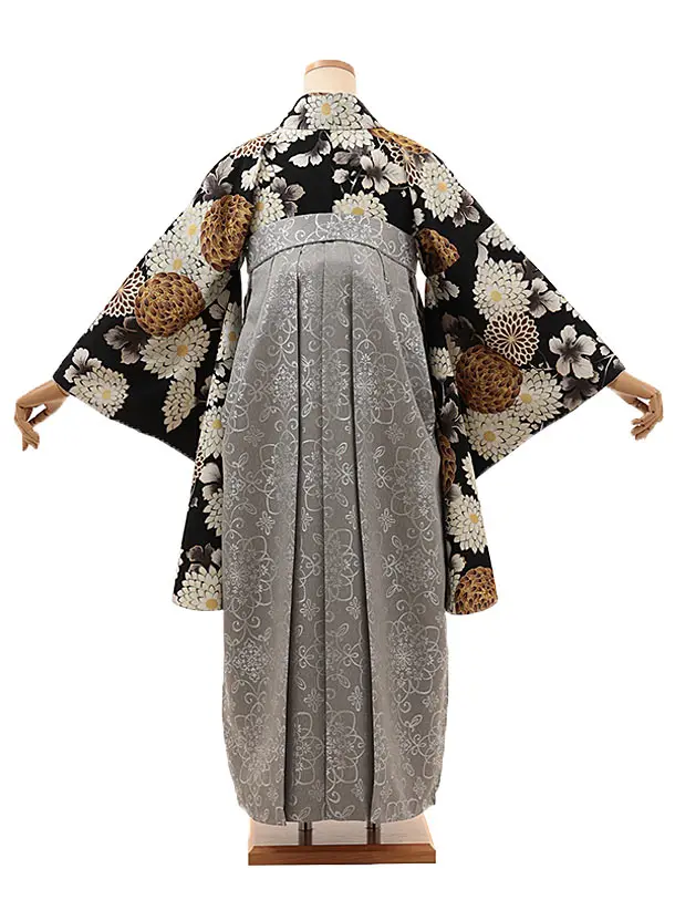 卒業式袴レンタルV147 黒地 菊×シルバーグレー