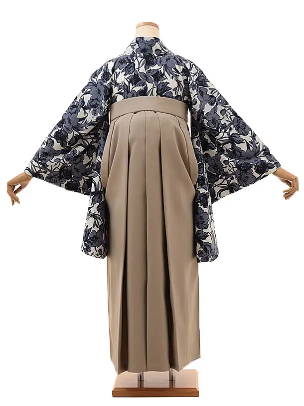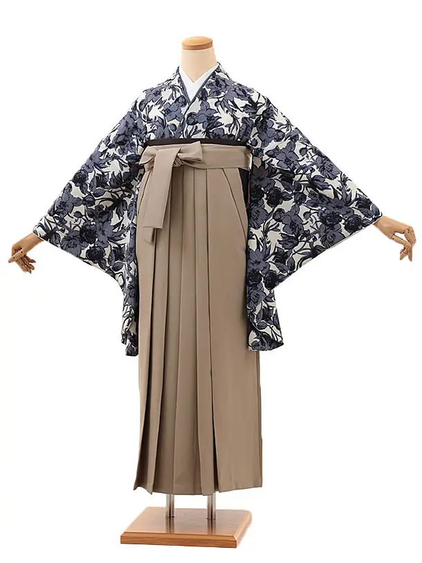 卒業式袴レンタルV175 白地ブルーグレー 花×ベージュ