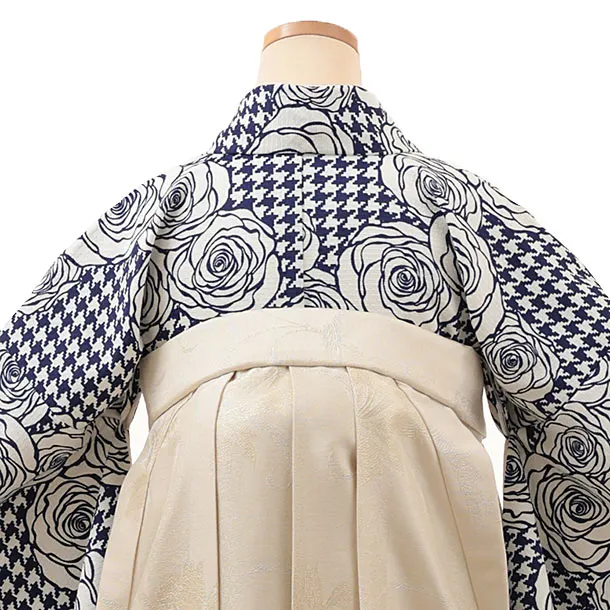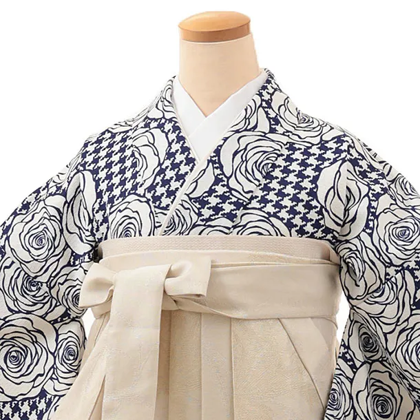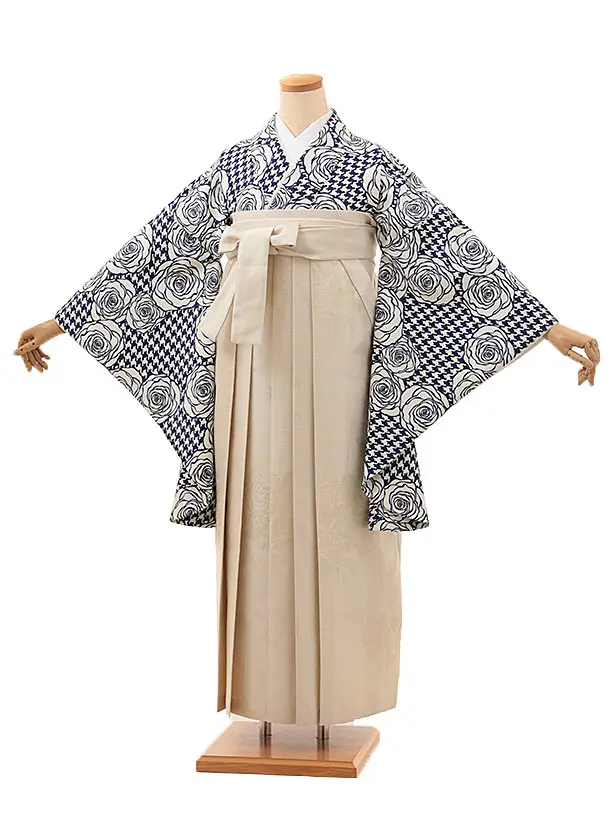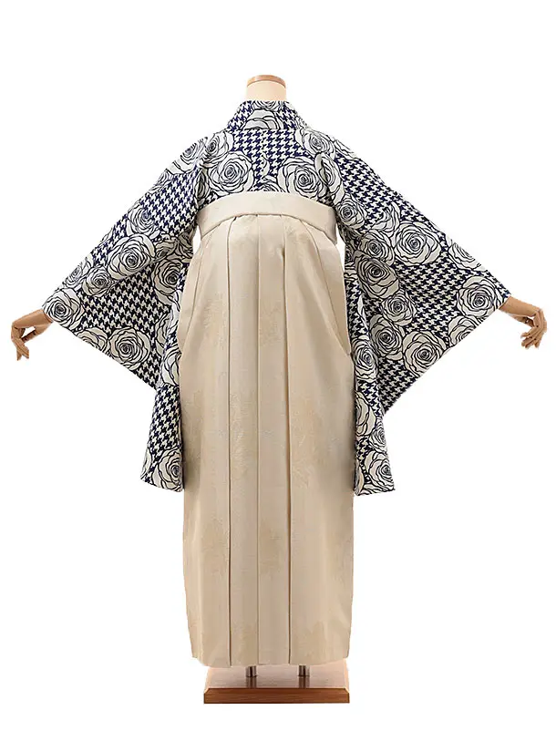 卒業式袴レンタルV212 白紺 千鳥格子 花×アイボリー花