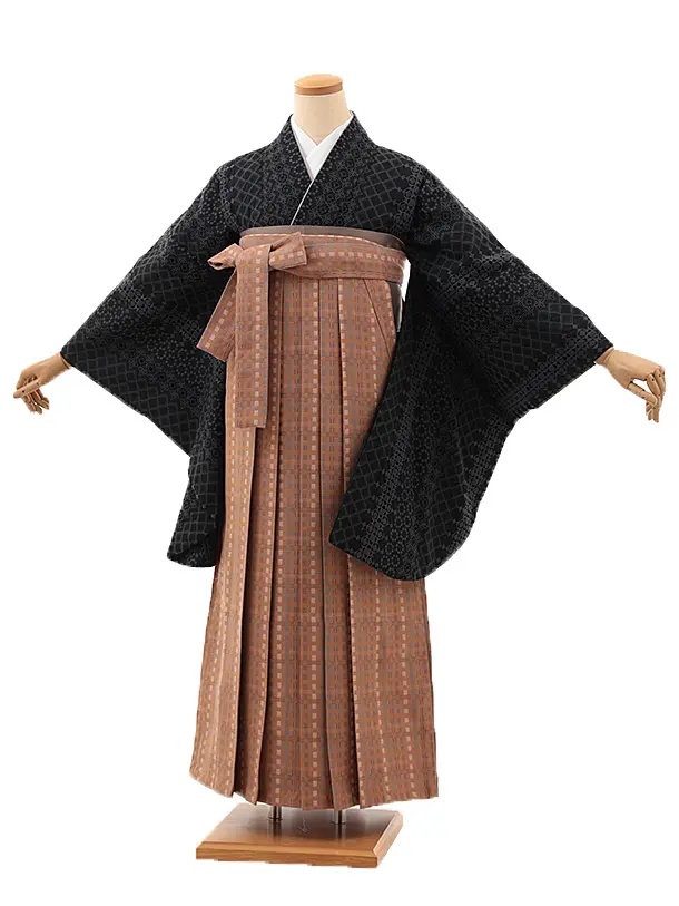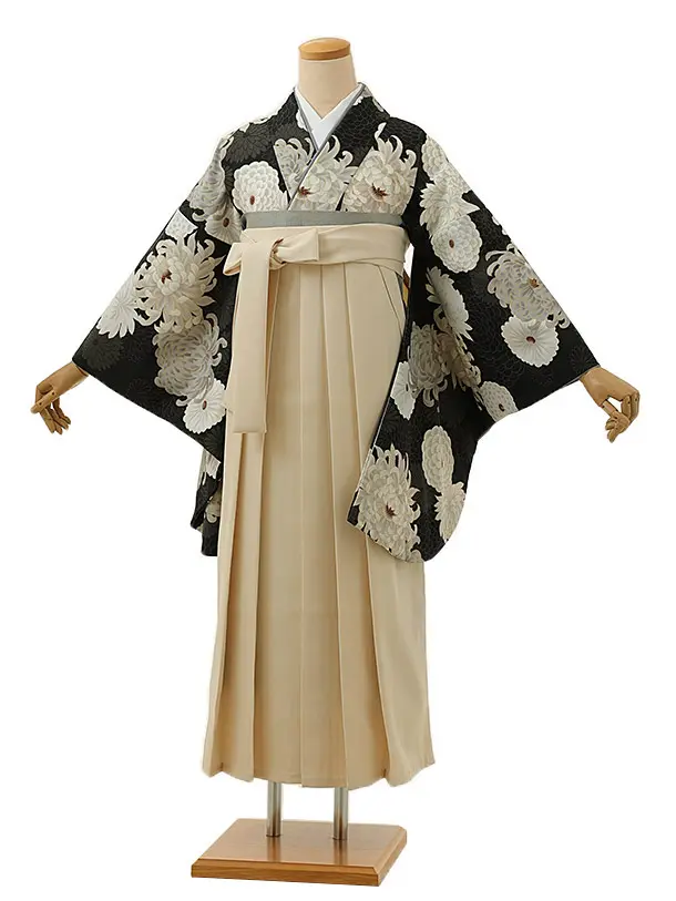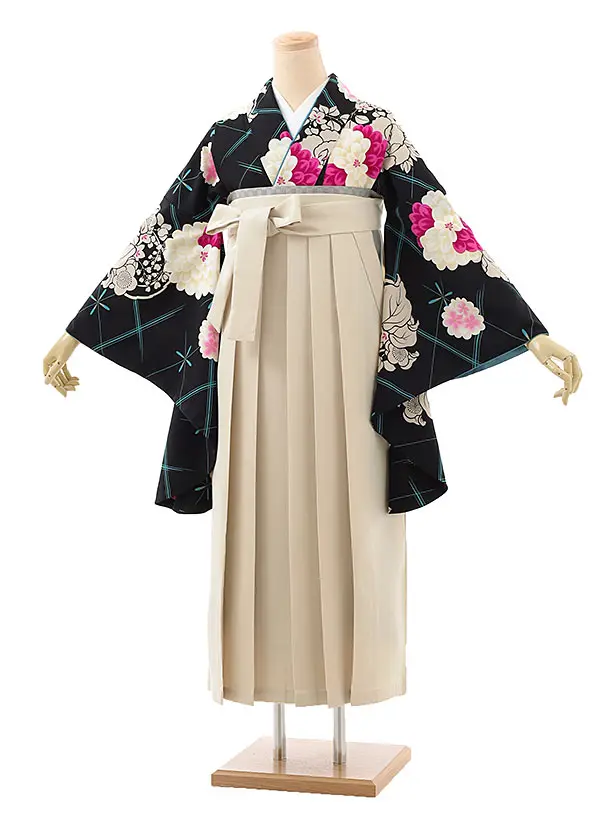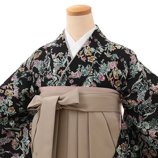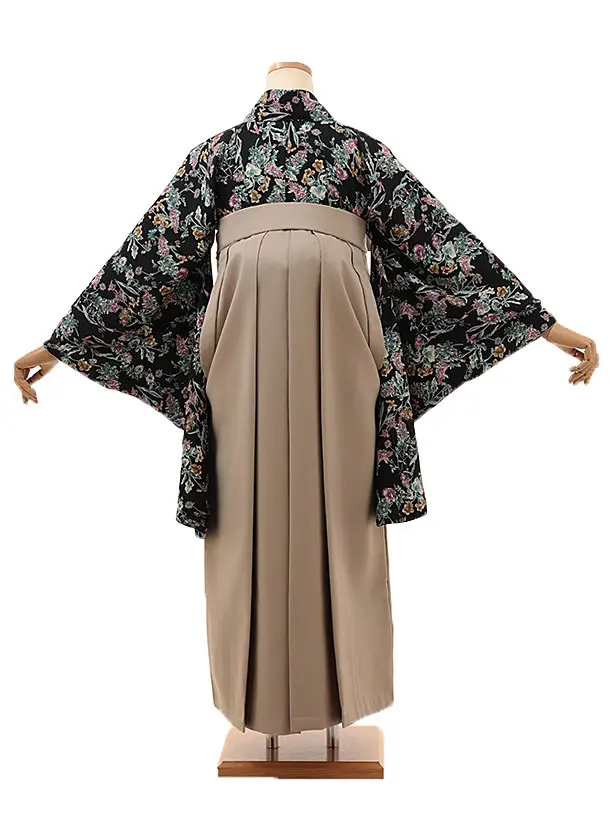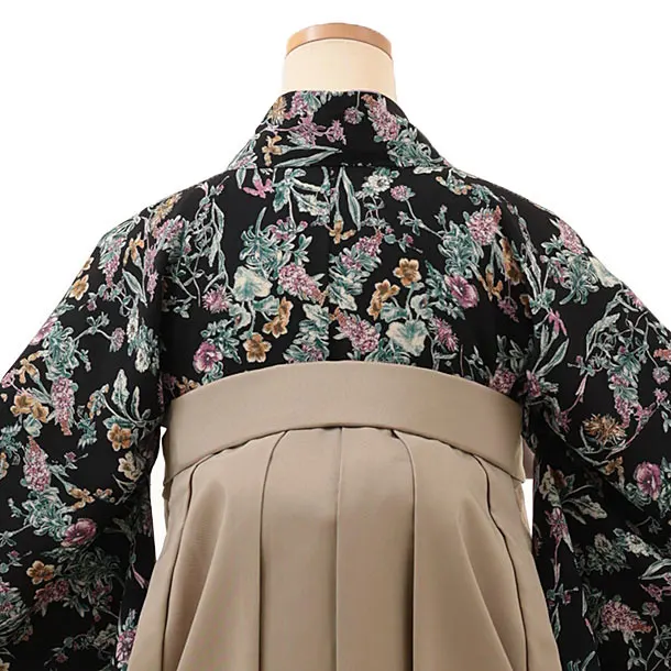 卒業式袴レンタルV214 黒地 小花×ベージュ