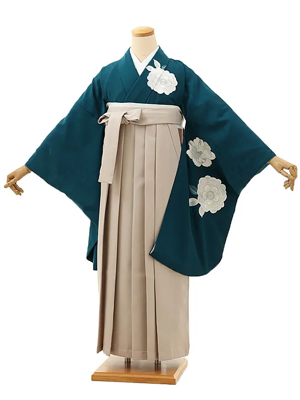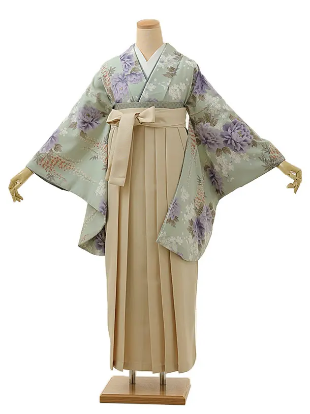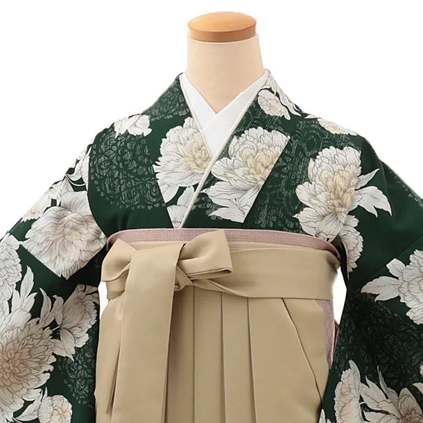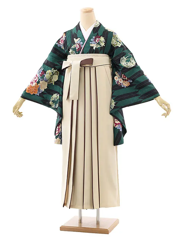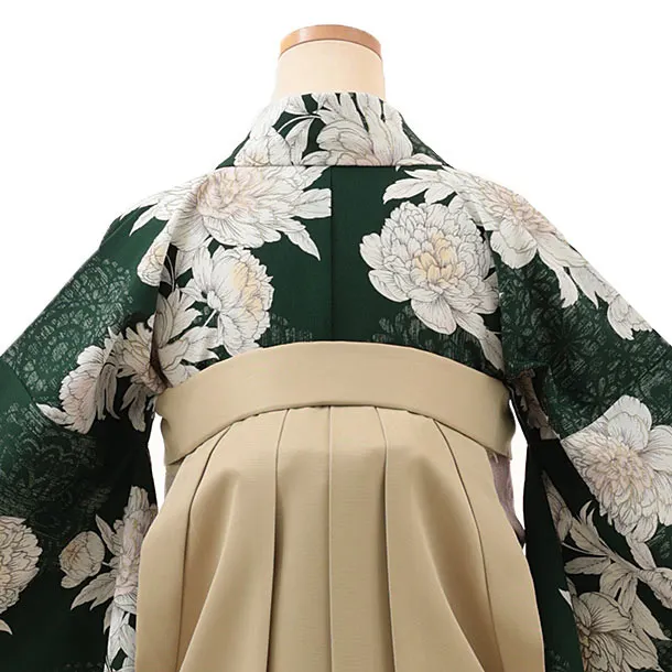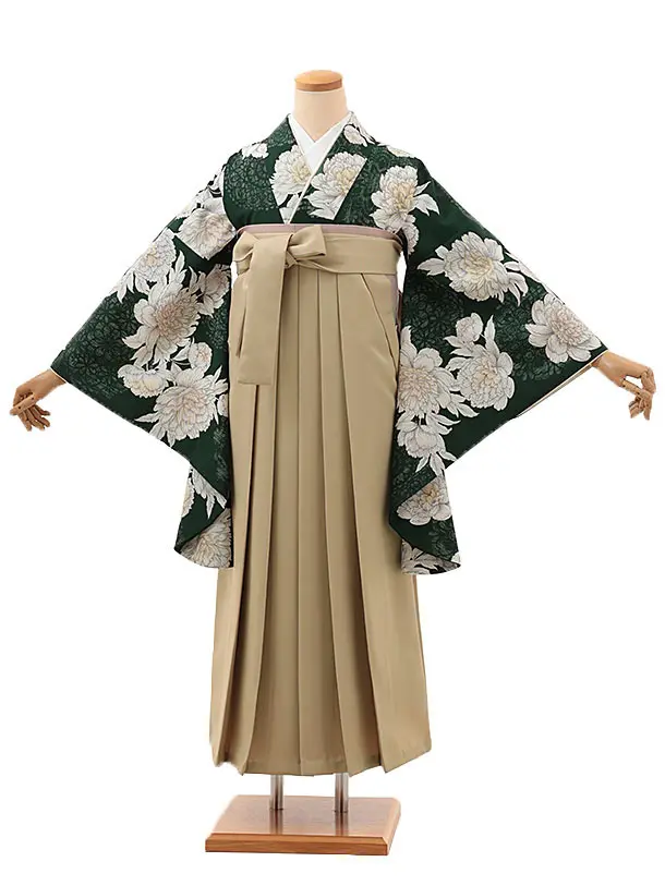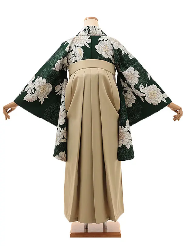 卒業式袴レンタルV226 グリーン 花×キャメルベージュ