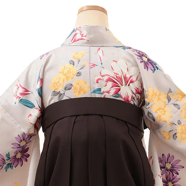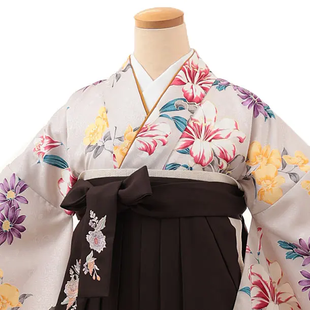 卒業式袴レンタルV241 グレージュ 花×こげ茶