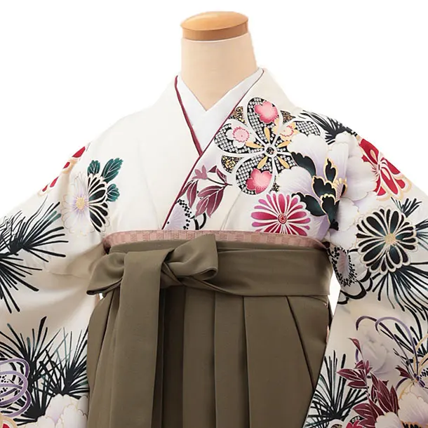 卒業式袴レンタルV245 白 梅菊×モスグリーン
