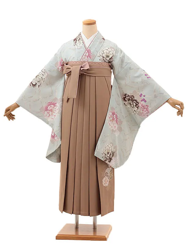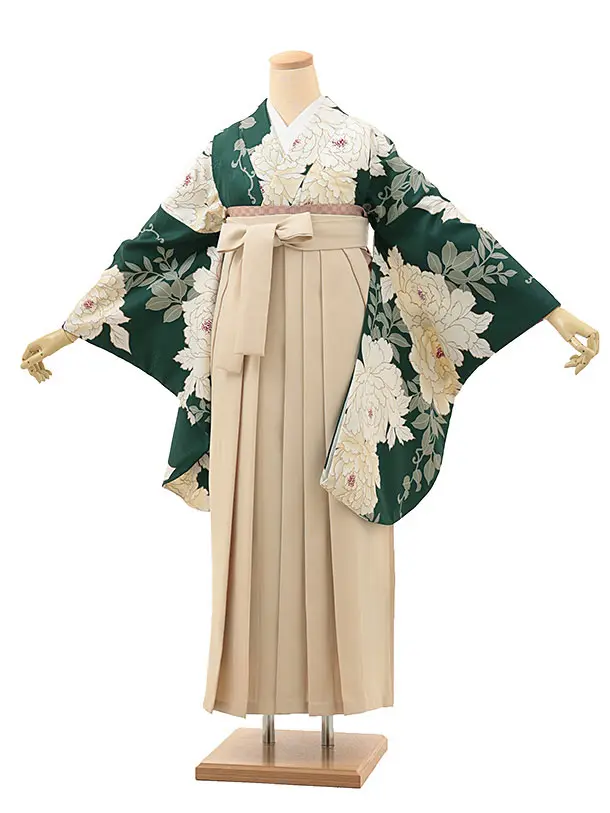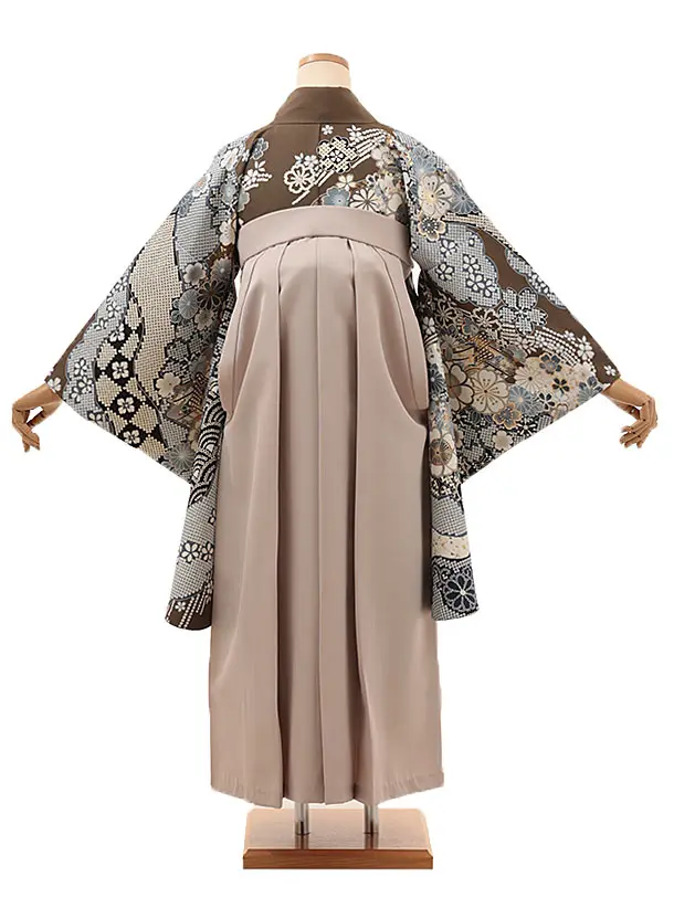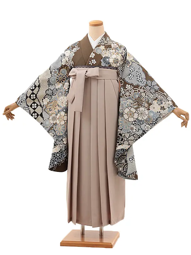卒業式袴レンタルV252 鶯茶色 御所車花×ベージュ