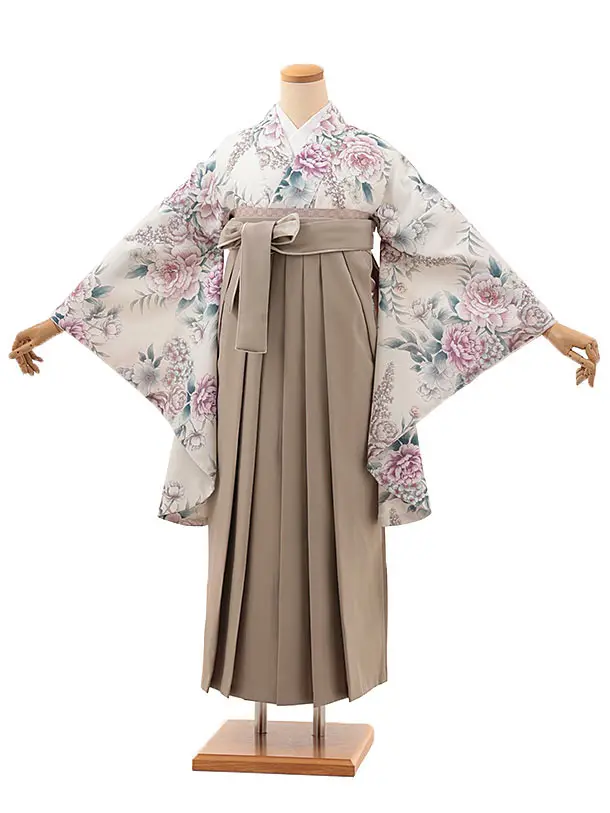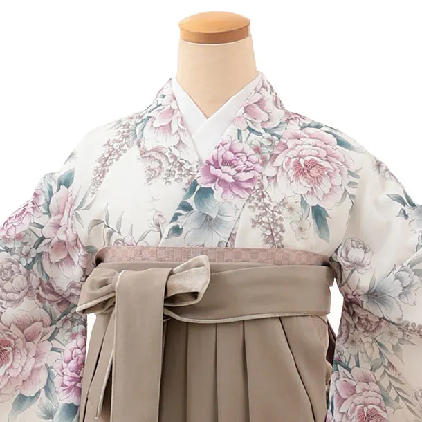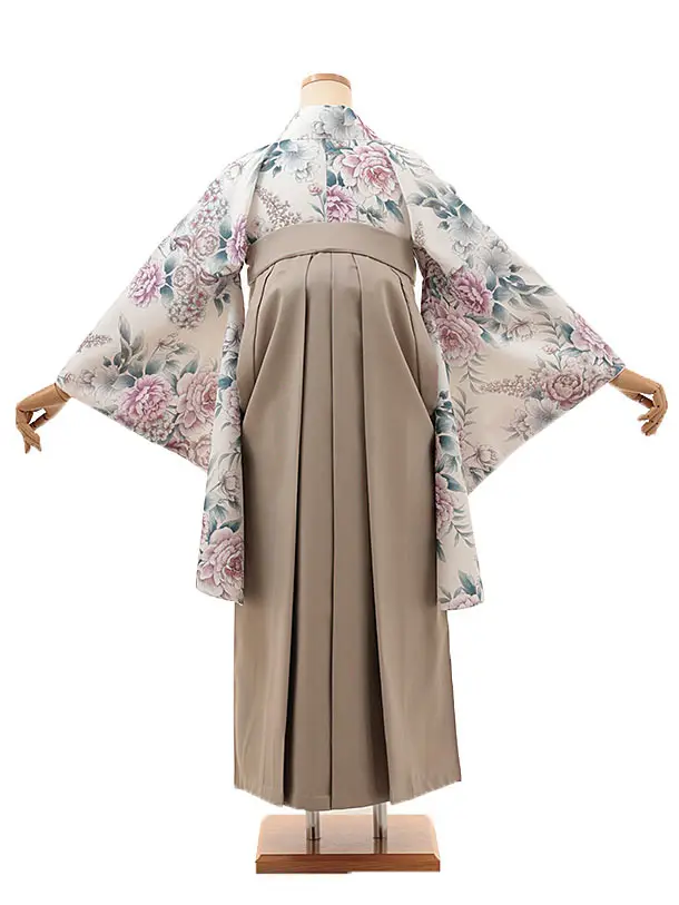 卒業式袴レンタルV272 オフホワイト地 ピンク花×ベージュ